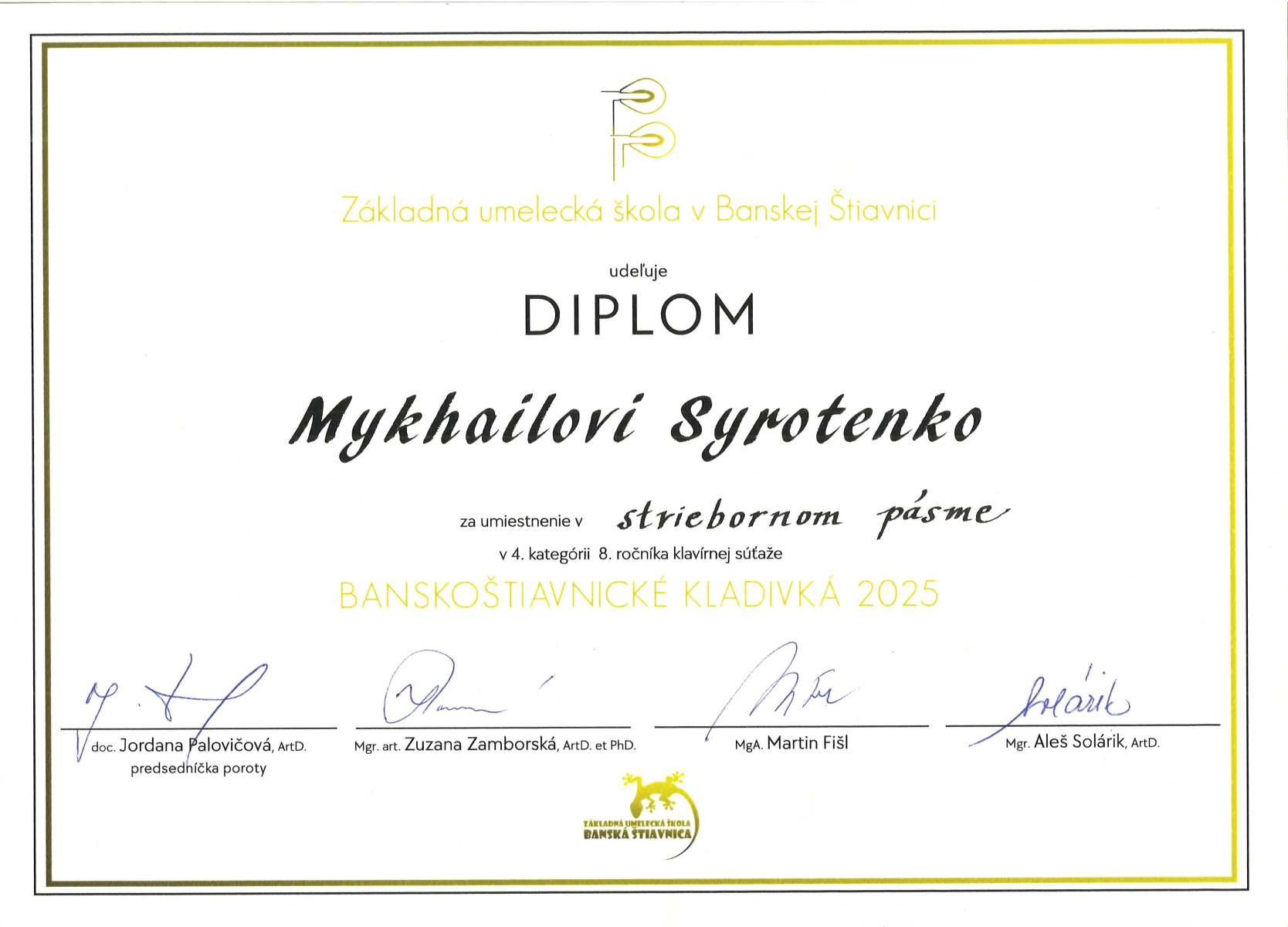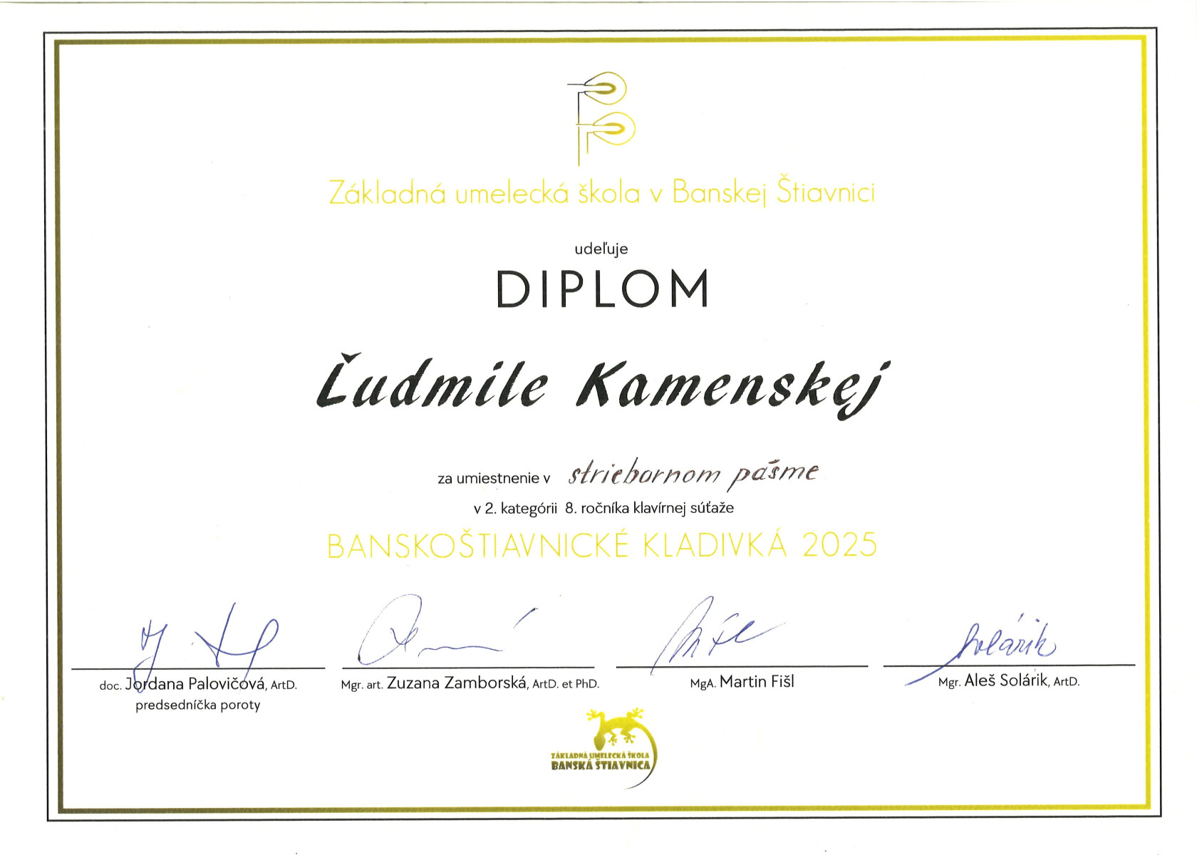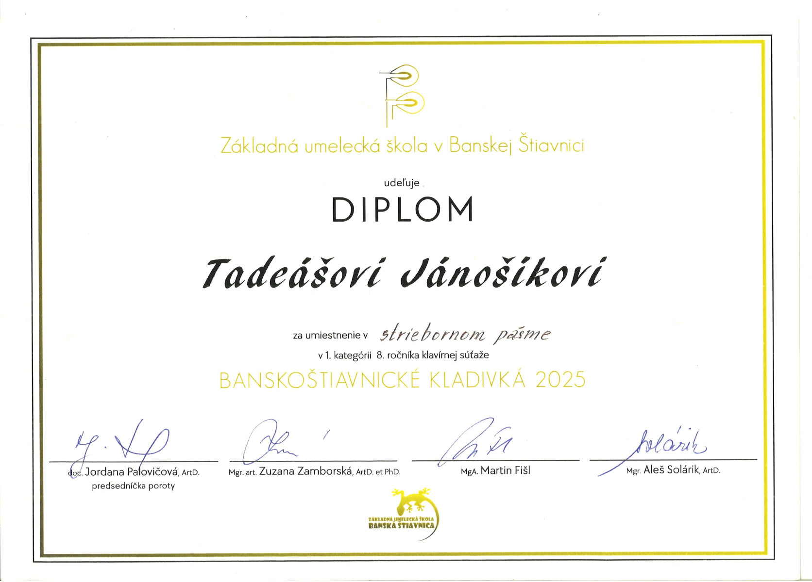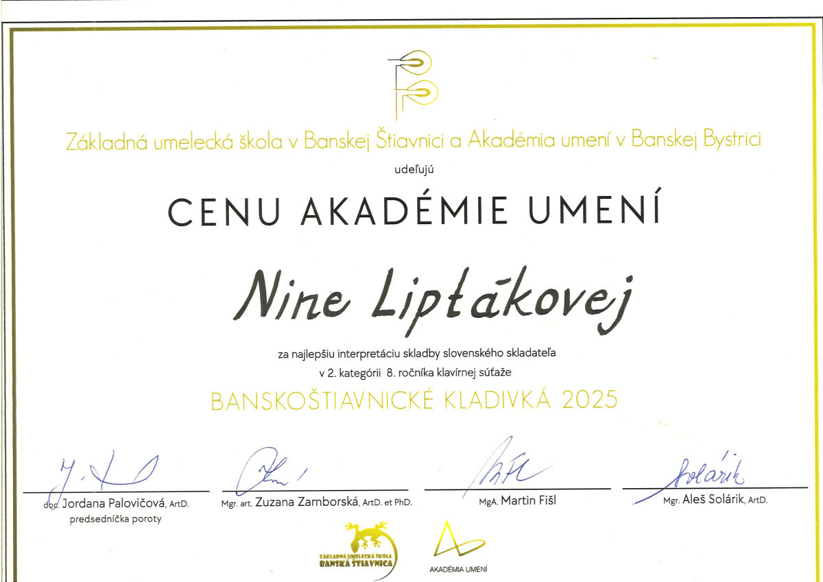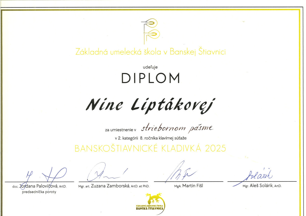 Tešíme sa, že sa tento rok odhodlali i naši žiaci zmerať si sily vo veľkej konkurencii šikovných klaviristov z celého Slovenska. Gratulujeme Tadeáš Jánošík (vedie p. učiteľ Gregor Zubek) , Ľudmila Kamenská (vedie p. učiteľ Martin Jánošík), Nina Liptáková (vedie p. učiteľka Tatiana Šusteková) a Mykhailo Syrotenko (vedie p. učiteľ Gregor Zubek). Všetci sa umiestnili v striebornom pásme a Ninka k tomu získala cenu Akadémie umení za interpretáciu skladby slovenského skladateľa. GRATULUJEME.