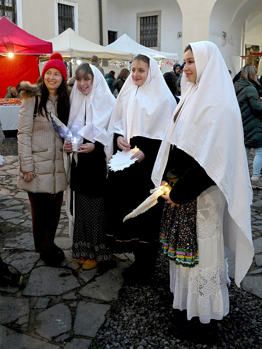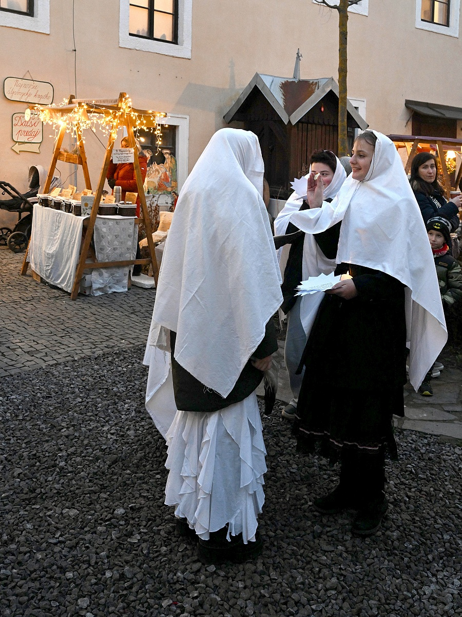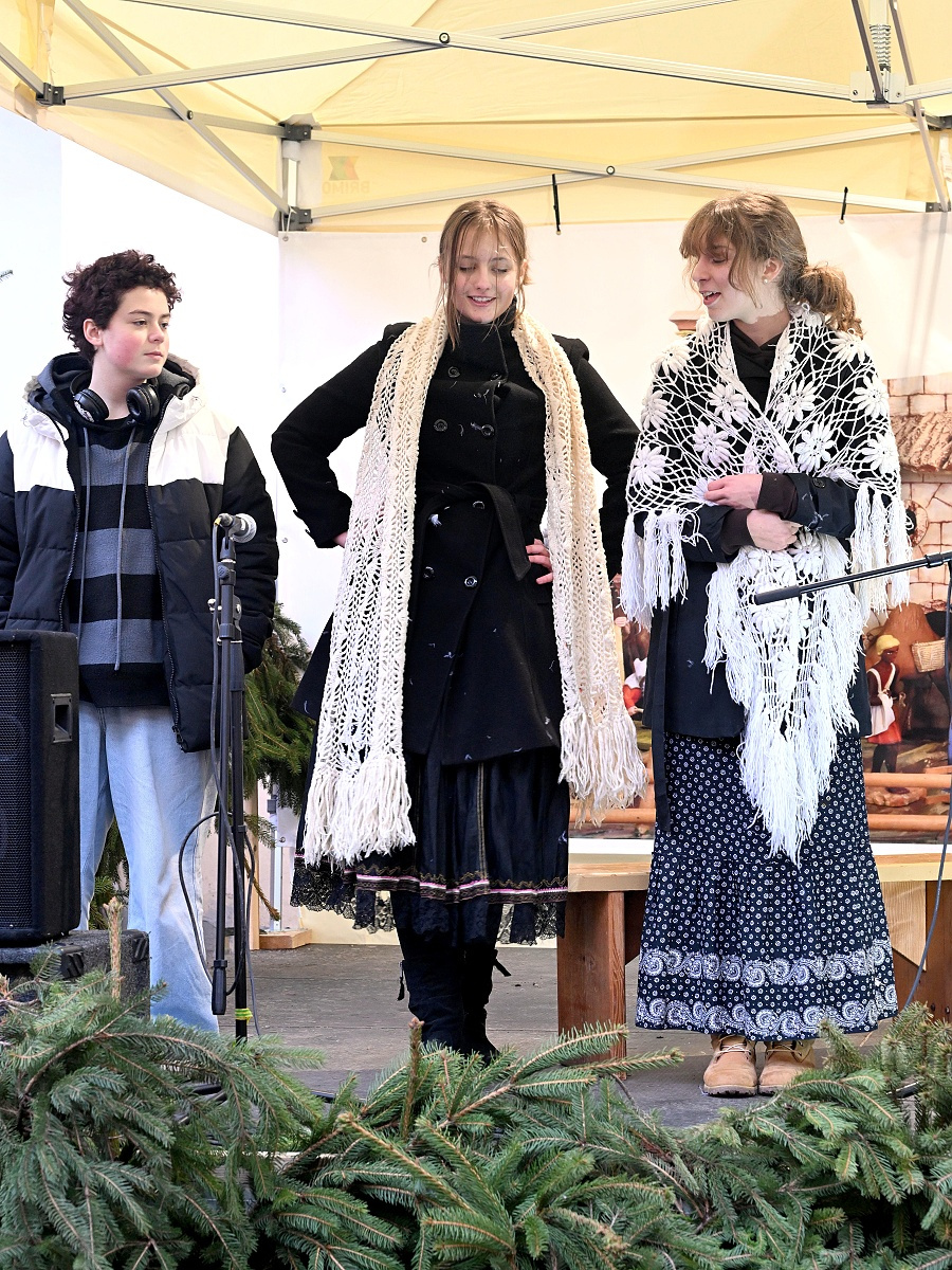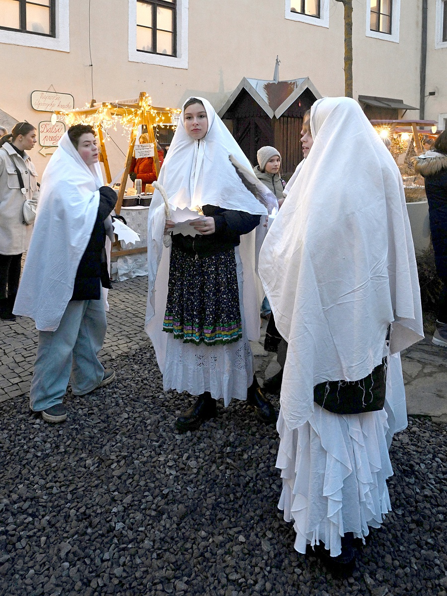 Lucie a páračky LDO a Dobrá zvesť detí speváckeho oddelenia ZUŠ na 20. ročníku Štyavnyckého vjanočného jarmoku v piatok na nádvorí.