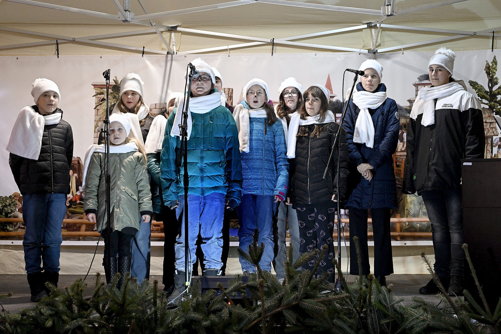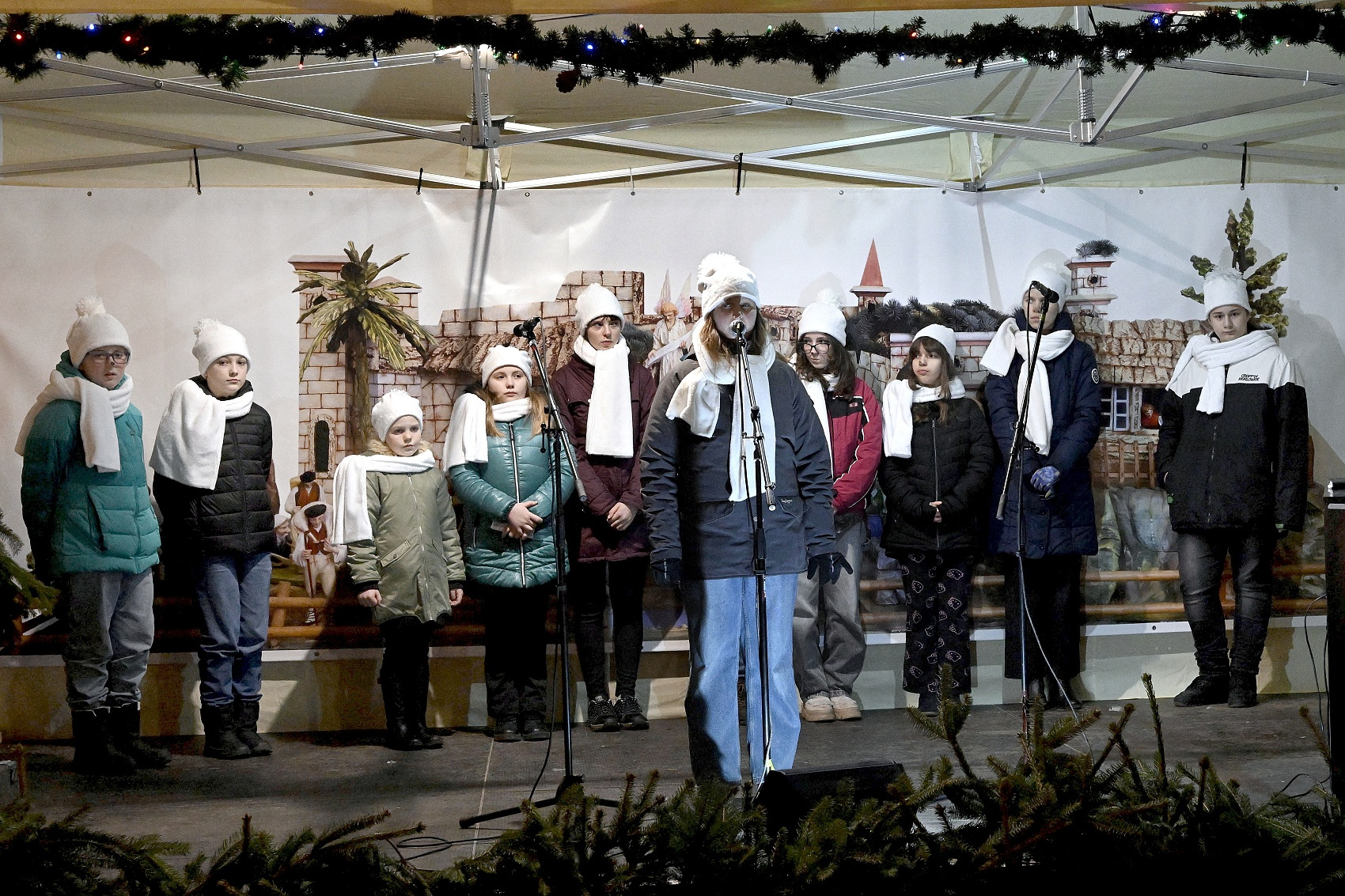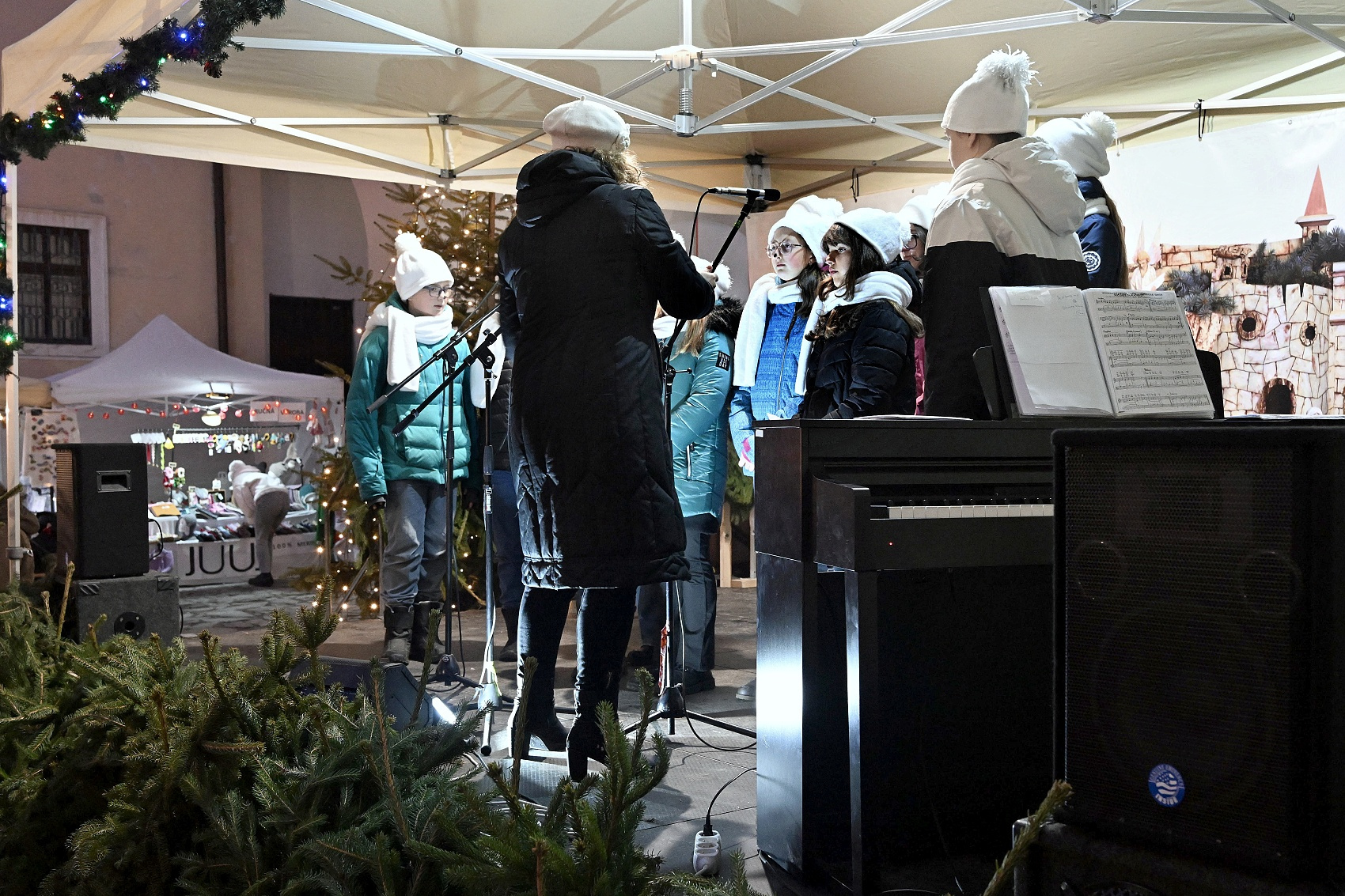 Lucie a páračky LDO a Dobrá zvesť detí speváckeho oddelenia ZUŠ na 20. ročníku Štyavnyckého vjanočného jarmoku v piatok na nádvorí.