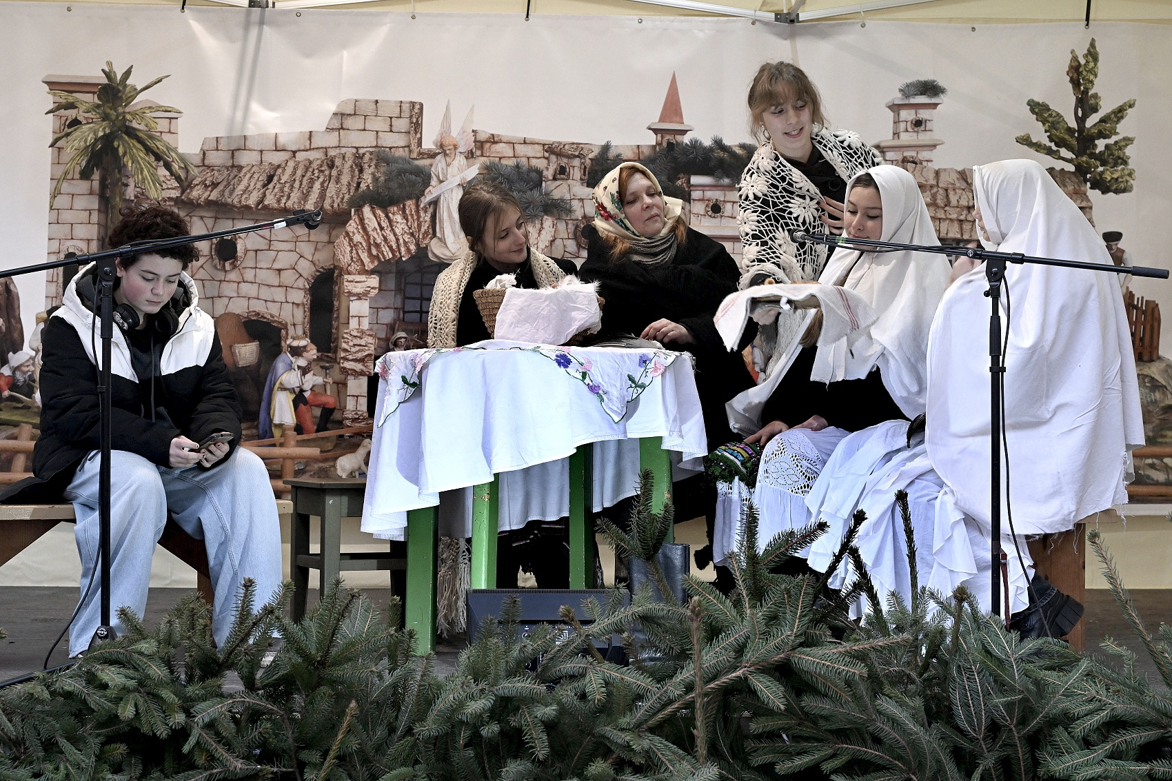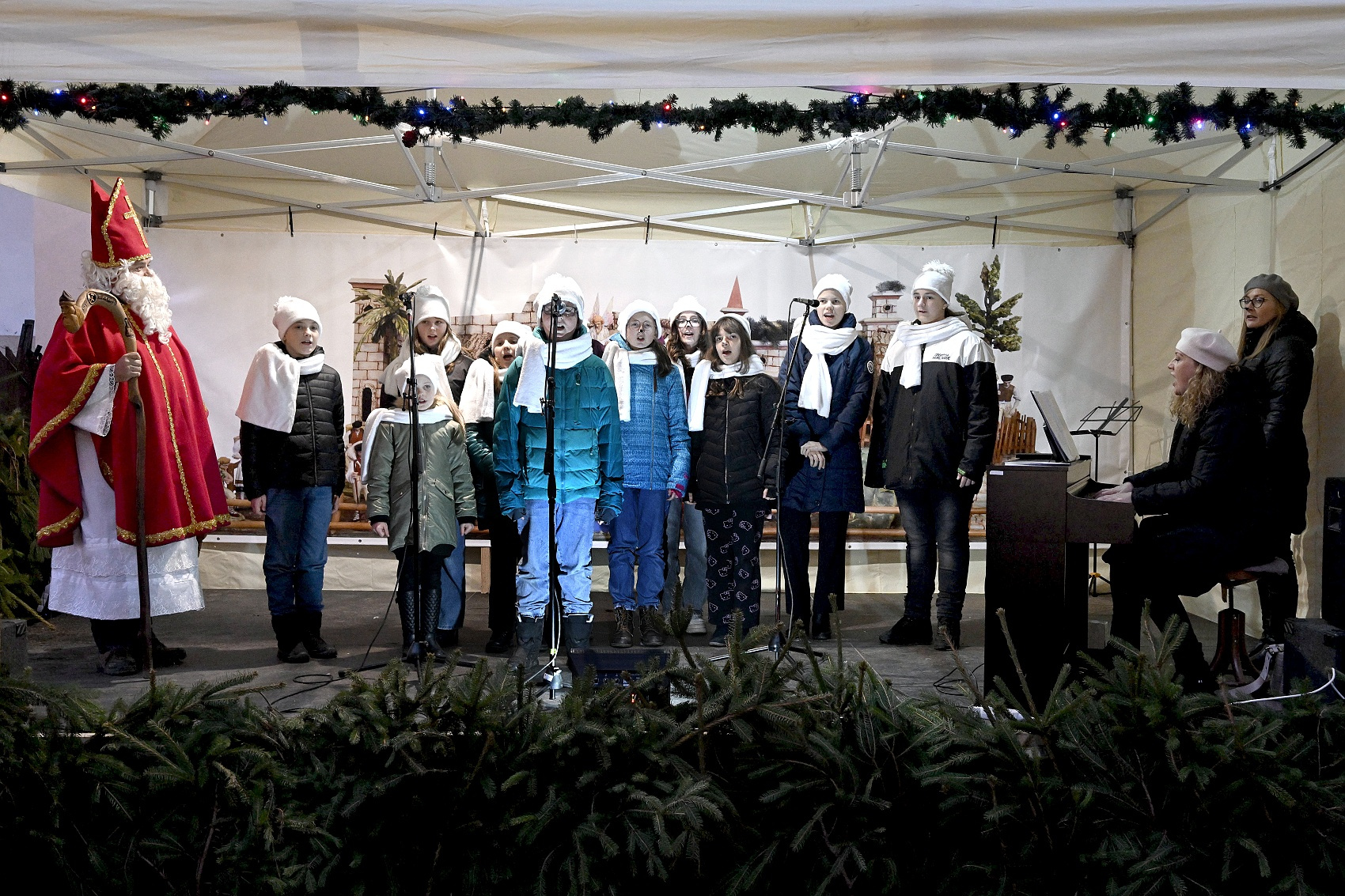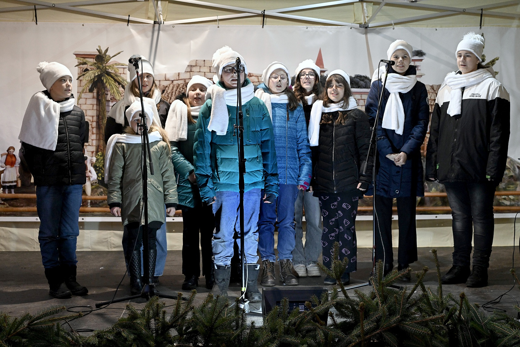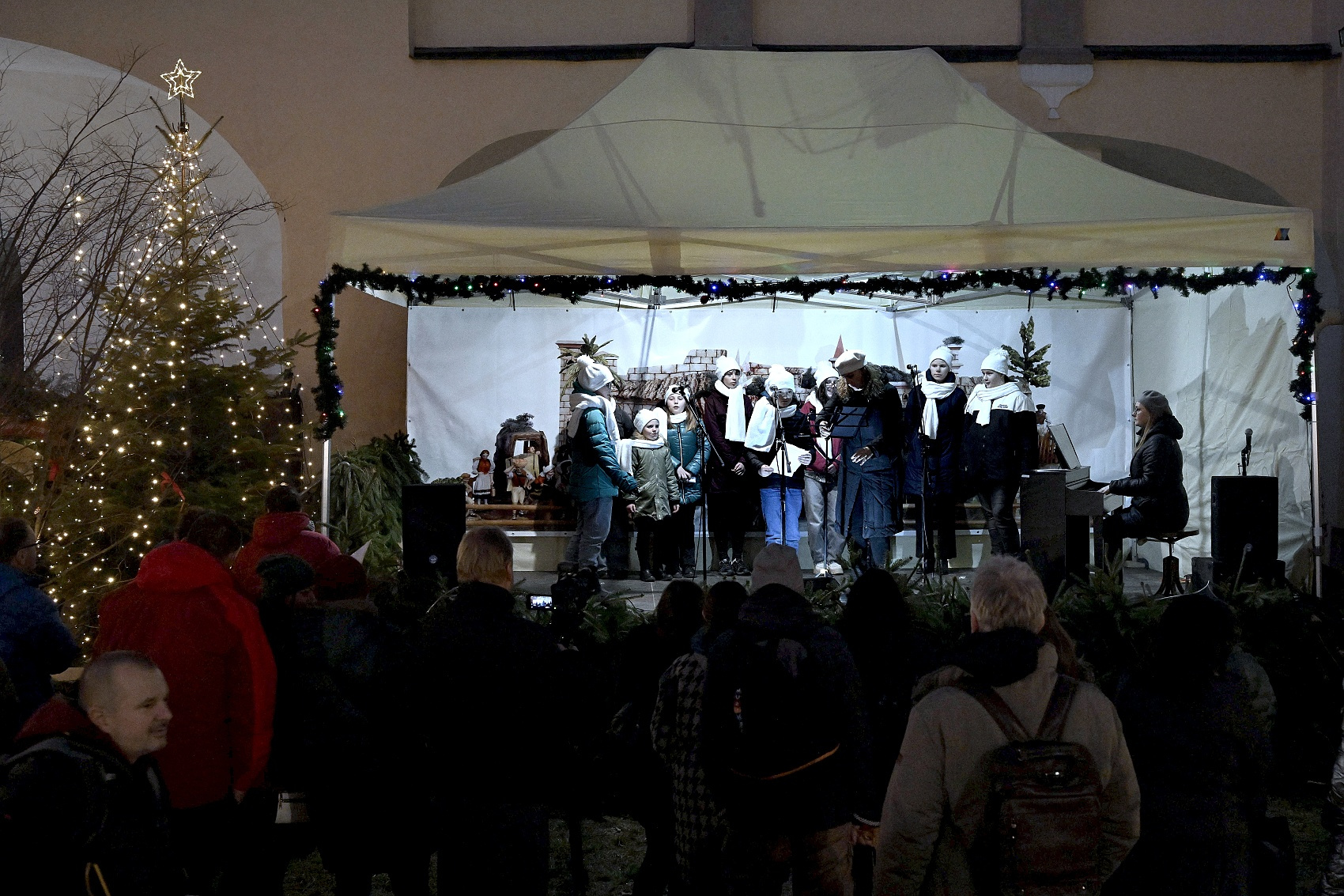Lucie a páračky LDO a Dobrá zvesť detí speváckeho oddelenia ZUŠ na 20. ročníku Štyavnyckého vjanočného jarmoku v piatok na nádvorí.