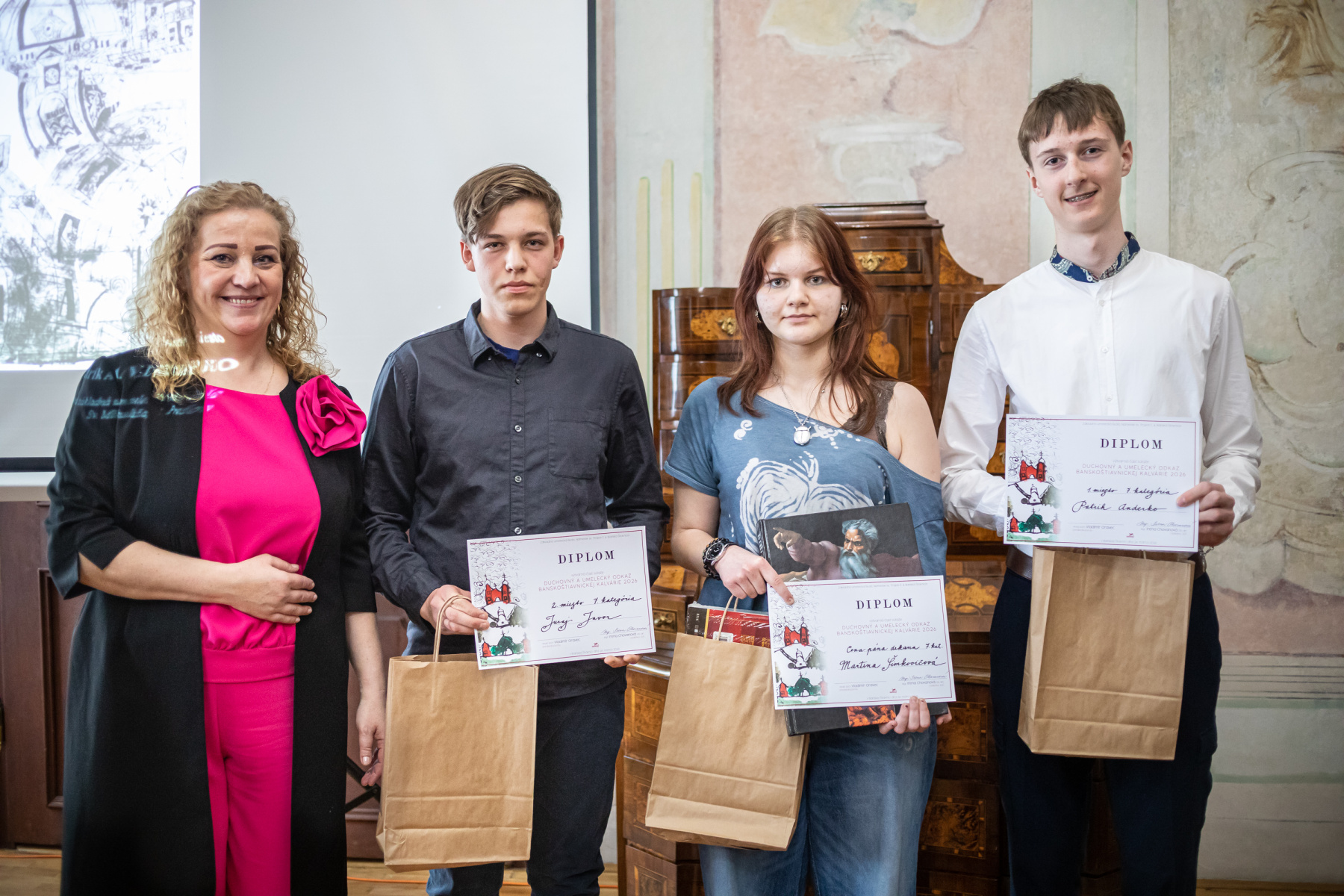 V utorok 24. marca sa konala naša „Kalvárska súťaž“ vzdávajúca hold jedinečnej barokovej dominante mesta KALVÁRII. Jej nevyčísliteľný umelecký i duchovný odkaz sme si pripomenuli výtvarnou a speváckou súťažou. Do výtvarnej časti súťaže bolo zaslaných asi 350 prác, speváckej súťaže sa zúčastnilo 37 spevákov. Prinášame súhrn aktivít a prác, ktoré sme v deň súťaže ako kolektív zvládli: Pripraviť triedy, baner, stoly, upraviť školu (pani Benková, p. Truban), pripraviť buletin s poradím a repertoárom účinkujúcich (Irena Chovanová), od 7:30 prijať cca. 70 účastníkov speváckej časti súťaže (Monika Lipovská), podať dve reportáže pre VIO tv a Rádio Lumen (vedenie), zapojiť do súťaže za našu školu 11 spevákov zo všetkých speváckych tried, moderovať spevácku súťaž a vernisáž (Terezka Beňová, Michal Timko), postarať sa o všetkých účastníkov, všetko odfotiť (Martin Jánošík), preniesť techniku, ceny, sukne do Kammerhofu (Matúš Piatrov, Róbert Borodajkevyč, Mirka Knezovičová), vypísať diplomy (Zuzka Kovárová), vypočuť si pozdrav pani primátorky (prečítala v úvode dňa p. Viera Ebert), privítať v Kammerhofe vzácnych hostí, žiakov, pedagógov, rodičov z celého Slovenska ocenených vo výtvarnej súťaži (asi 80 ďalších zúčastnených). Premietať fotoprezentáciu prác, zaspievať prítomným so Zboríkom dve gospelové piesne, poďakovať a dať priestor podporovateľom podujatia (za farnosť BŠ pánovi dekanovi Norbertovi Ďurdíkovi, za Kalvársky fond Martinovi Macharikovi, za Mestské lesy p. riaditeľovi Slavomírovi Kickovi, , za poroty Arpádovi Pálovi, a Stankovi Bartkovi), venovať sa odbornej porote (Stanislav Bartko, Miroslava Mičicová s predsedom svetového rozmeru – operným spevákom pred časom pôsobiacim v Metropolitnej opere v New Yorku, či v La Scale Štefanom Kocánom)
