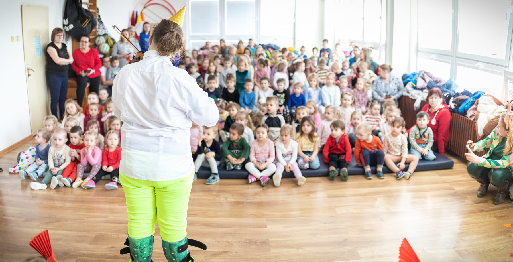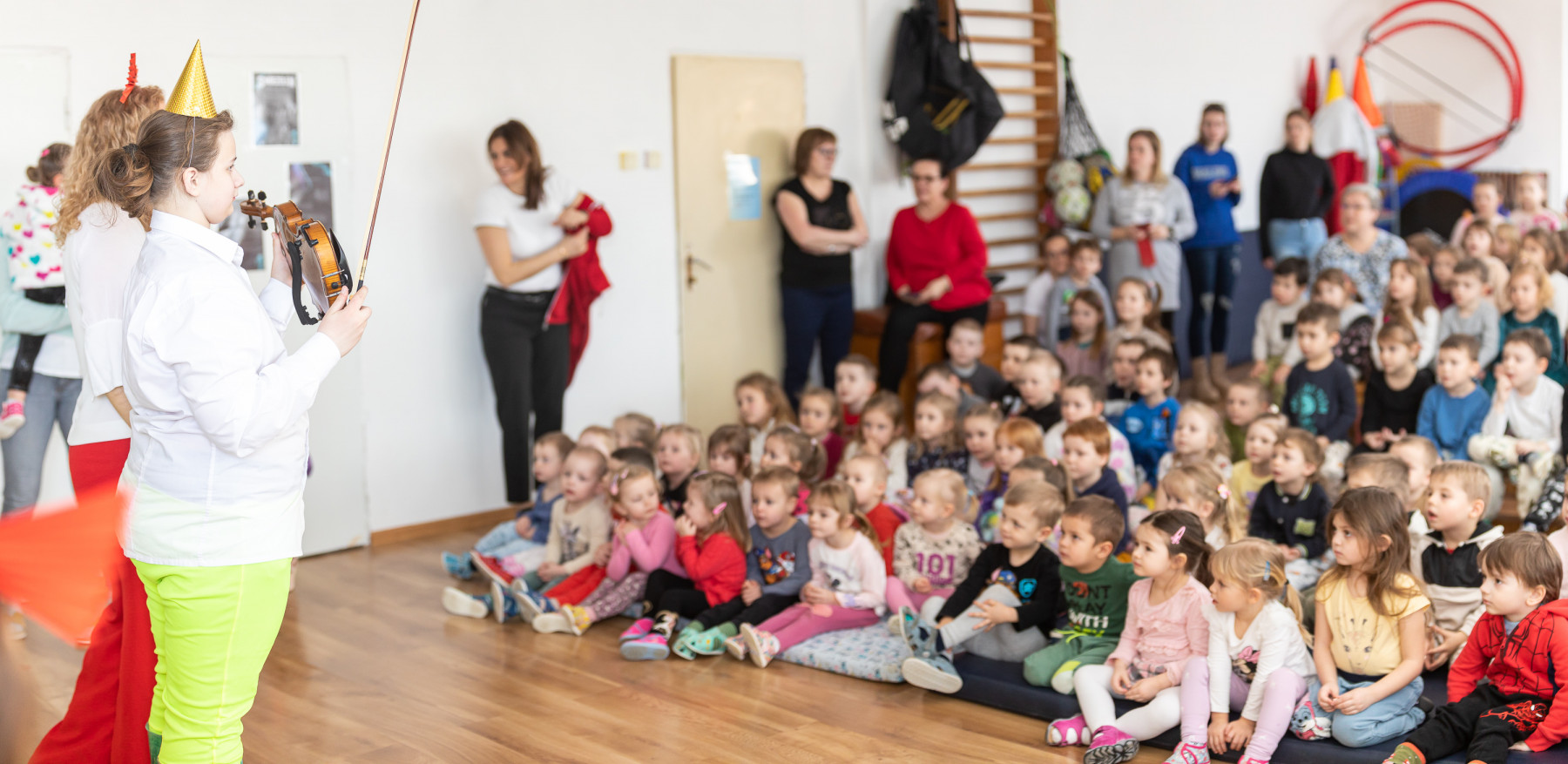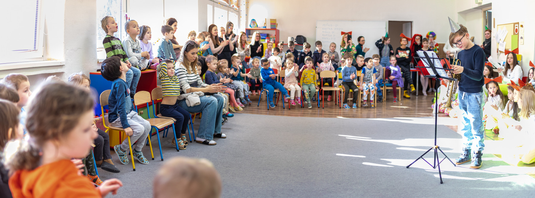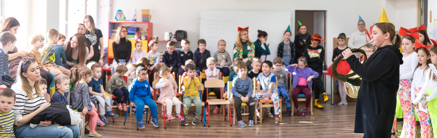 ..V rámci spolupráce s materskými školami organizujeme každoročne výchovné koncerty. Detičky v škôlkach. Je to vždy zážitok a celkom výzva zaujať najmenšie detičky a predstaviť im čaro hudby, tanca, divadla. Za jedno dopoludnie sme s deviatimi pánmi učiteľmi (M. Jánošík, P. Weisová, I. Chovanová, Z. Kovárová, Ľ. Klimková, I. Beňová, J. Janiczek, R. Borodajkevyč, Knezovičová, s pánom Trubanom a s asi 25 žiakmi navštívili tri rôzne predškolské zariadenia. Po minuloročnom „námorníckom“ programe sme prišli ako CIRKUS HUMBERTO, ktorého príchod do škôlok bubienkom ohlasoval Janko Chovanec. Deťom sme zaspievali, zahrali i zatancovali najskôr v MŠ KSŠ sv. Františka Assiského, pokračovali sme v MŠ Križovatka 1 a svoje „cirkusové turné“ sme zakončili v MŠ Bratská na Drieňovej. V asi 50 minútovom programe deťom a pani učiteľkám zatancovali šikovné tanečnice – baletky Peťka Benčajová a Sofia Moudrá a veselými vstupmi prispeli žiačky literárno-dramatického odboru Jasna Razawi a Liana Šavoltová. Inšpiráciou pre p. riaditeľku pri príprave výchovného koncertu bola krásna melódia Karla Svobodu z českého seriálu Cirkus Humberto, ktorej verše prebásnila na jednotlivé HUDOBNÉ NÁSTROJE. Škôlkári sa tešili, počúvali, žasli, usmievali sa, tlieskali a aj spievali. Postupne sme predstavili husle (Peter Sopko zahral Menuet od Bocceliniho) , klavír (skladbičku Tanec od Martina Jánošíka zahrala Noemi Imrišková), flautu (skladbu s príznačným názvom Cirkus zahrala Karolínka Filkorová). Zaznel i akordeón (Richard Lupták sl. ľudová Dedinka v údolí), efektná trúbka (Viliam Lipták zanôtil pieseň My Dream), lesný roh (rozoznela poľovníckymi signálmi Uvítanie a Začiatok činnosti Hanka Malatincová). Pri speve sme zdôraznili, že ten najvzácnejší „hudobný nástroj“ máme vo svojom hrdle. Zvonivým hlasom prispeli Bianka Vasiľová v pop. piesni Chytila jsem na pasece motýlka a Hanka Kminiaková v ľud. piesni Sitno moje Sitno. Bubeníčka Alicka Knezovičová hravo prezentovala rôzne druhy bicích nástrojov a zahrala sa s detičkami hru na ozvenu. Gitarovou skladbičkou Jar prípravkárka Sofinka Chrančoková spolu sp. uč. Robkom privolávala jar a predstavila jednotlivé časti gitary.