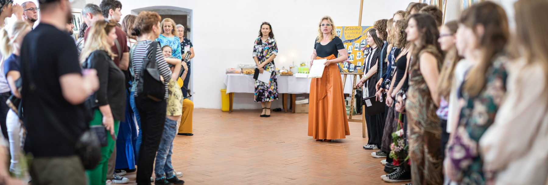 P. zástupkyňa Miroslava Knezovičová uviedla gitarové číslo svojej dcéry Alici Knezovičovej.   Krásne tóny v krásnom priestore utíšili prítomných hostí a úvodné slovo prevzala pani riaditeľka Irenka Chovanová . Vyzdvihla význam „umenia“ a „výtvarného umenia“ ako takého v živote mladých ľudí,   aj prácu pedagógov, ktorí  ich k nej vedú. Členka rady rodičov pri ZUŠ a naša spriaznená duša výtvarného odboru Petra Maruniaková sa tiež prihovorila tohtoročným absolventom.