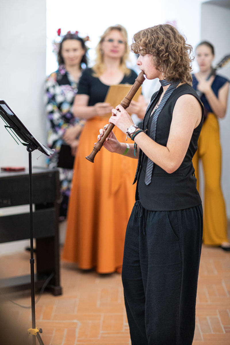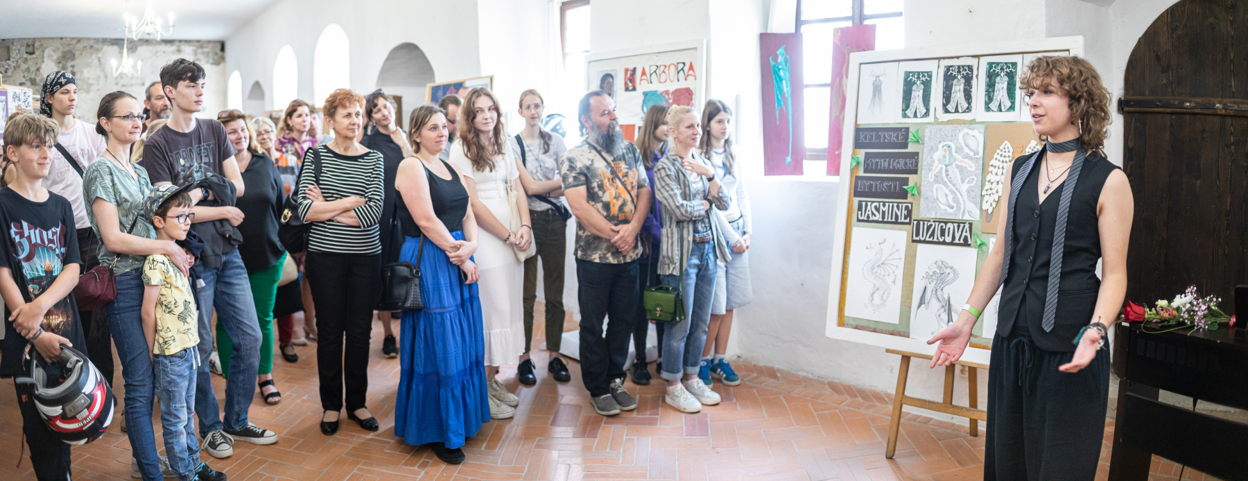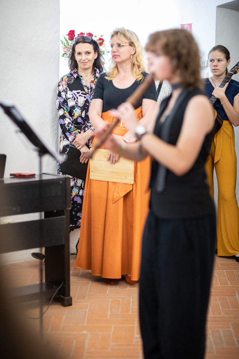 Prezentáciu absolventských prác p. uč. Miroslavy Knezovičovej uviedla svojím flautovým vystúpením nadaná výtvarníčka a aj hudobníčka Jasmín Lužicová s klavírny sprievodom I. Chovanovej. Keltské melódie plynule vtiahli divákov do jej témy „Kelstkých mytologických bytostí“. Ich čarovný svet namaľovalala aj na drevených doskách v tvare ikon.