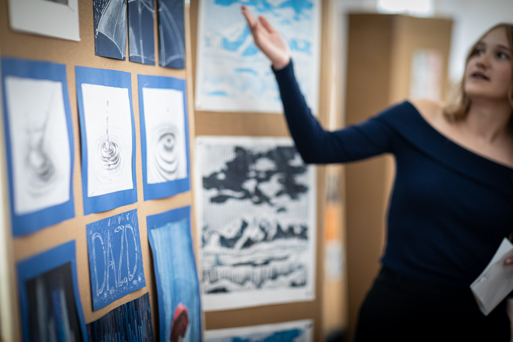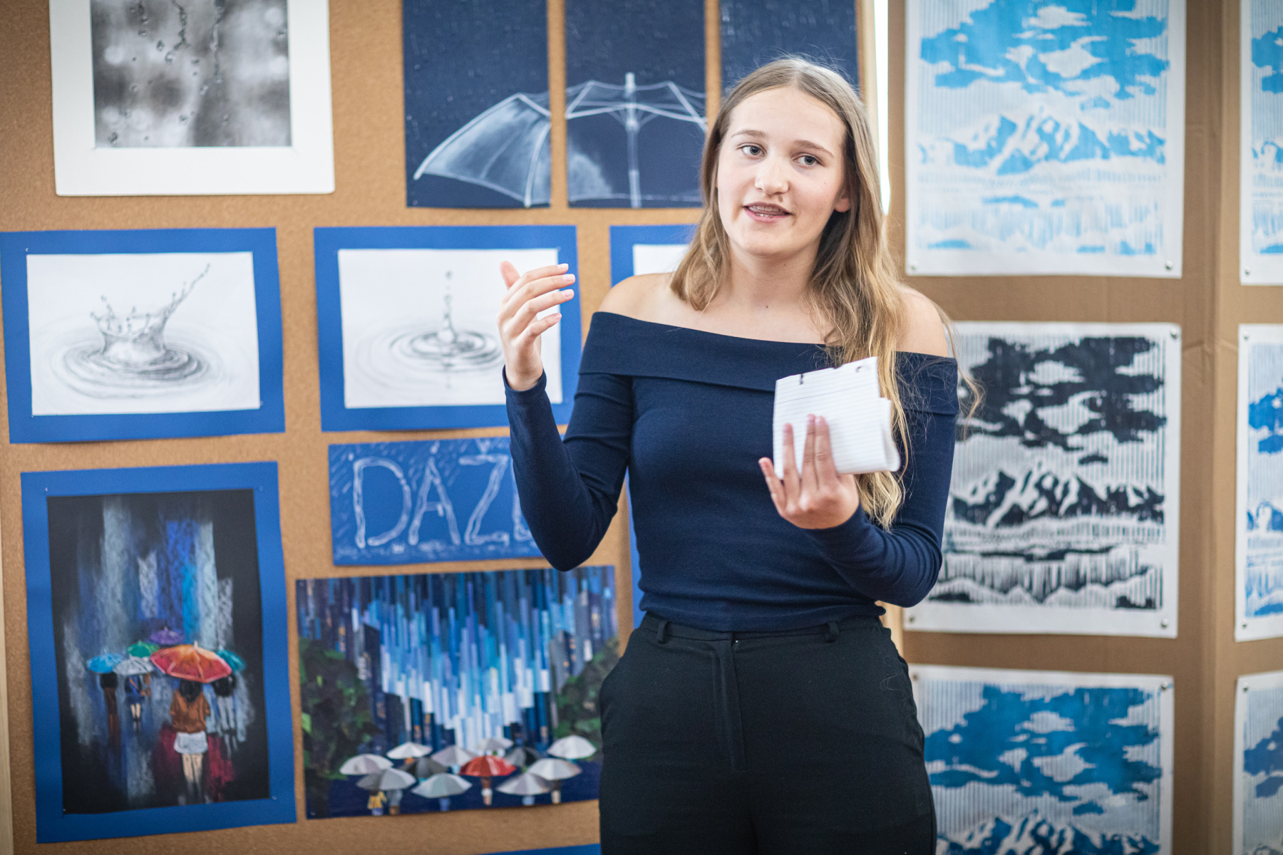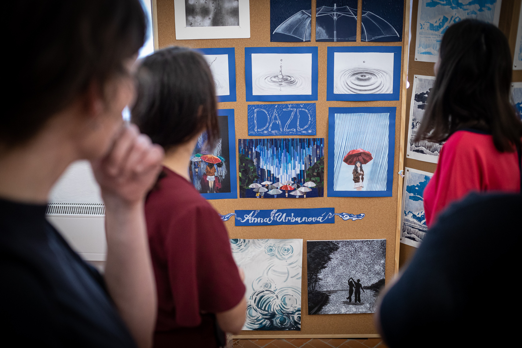 To , že „Dážď“ vie byť aj príjemný, nám na svojich dielach ukázala Anna Urbanová.  Zastavila kvapky dažďa na priesvitnom dáždniku aj na kartónoch. Sledovala ich dopad na vodnú hladinu v kresbách.