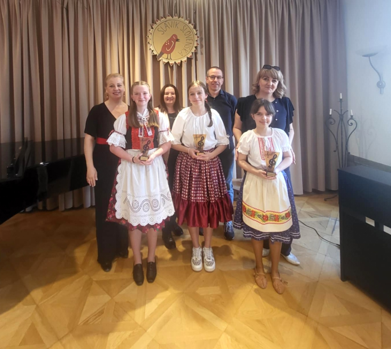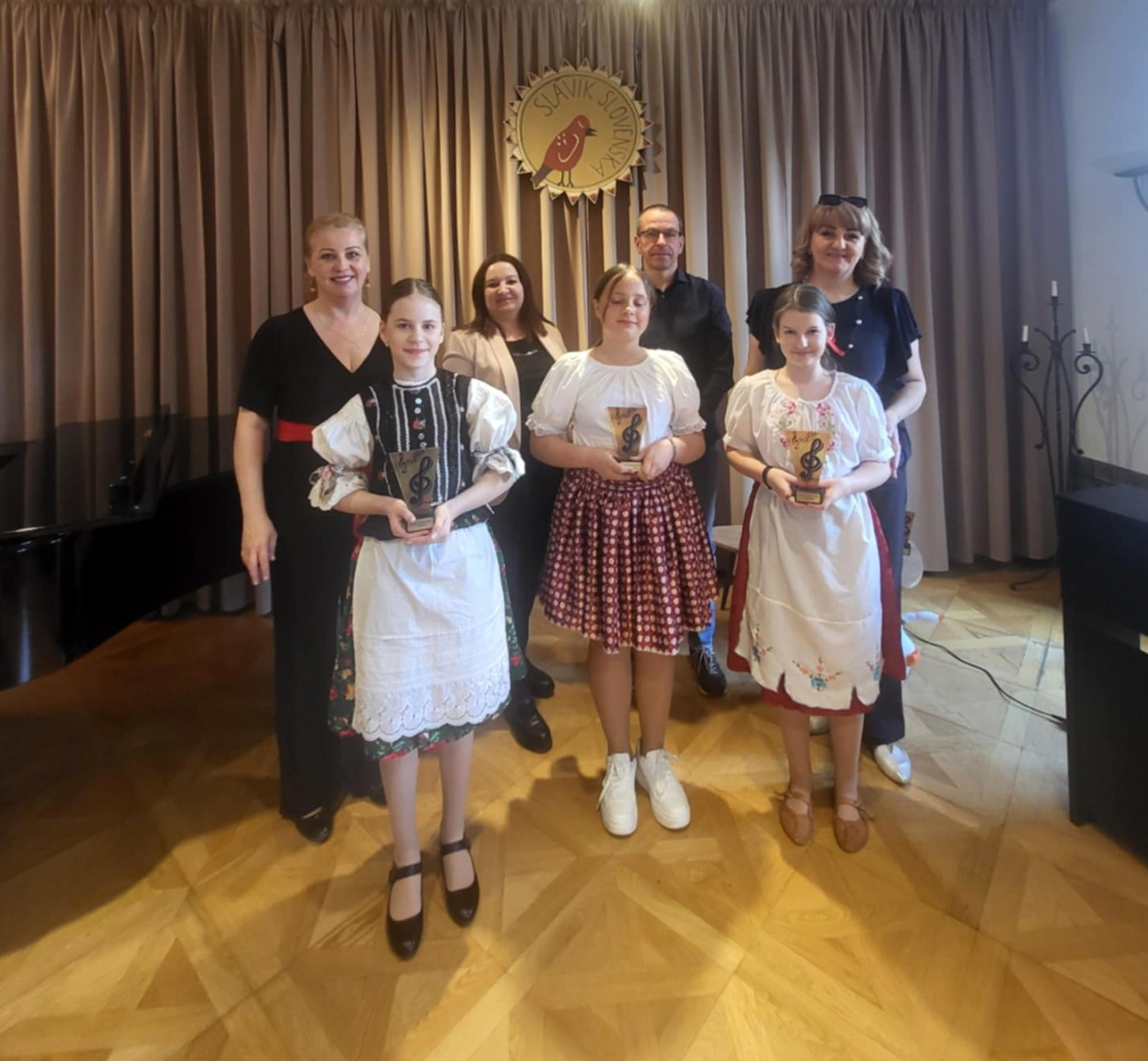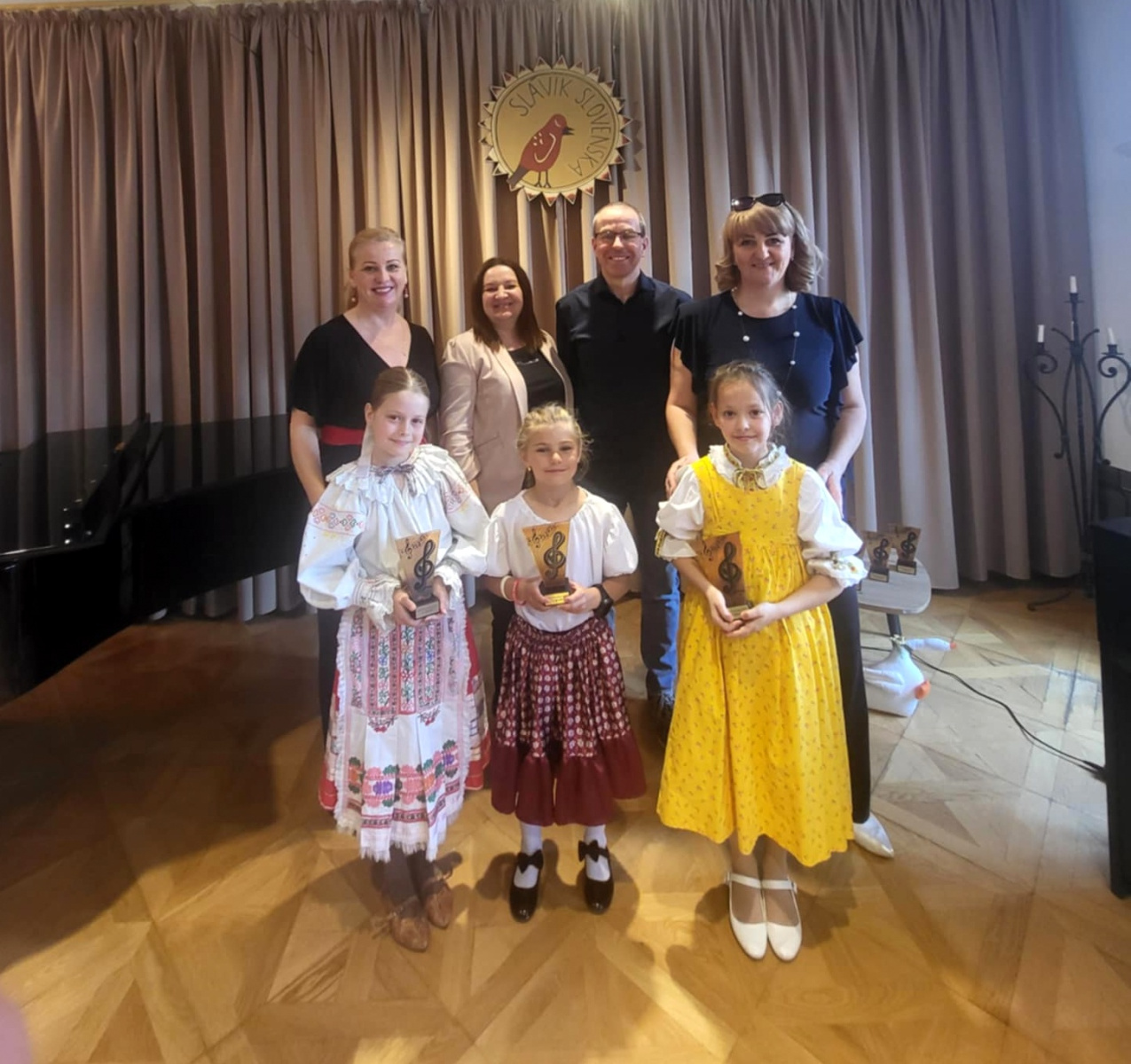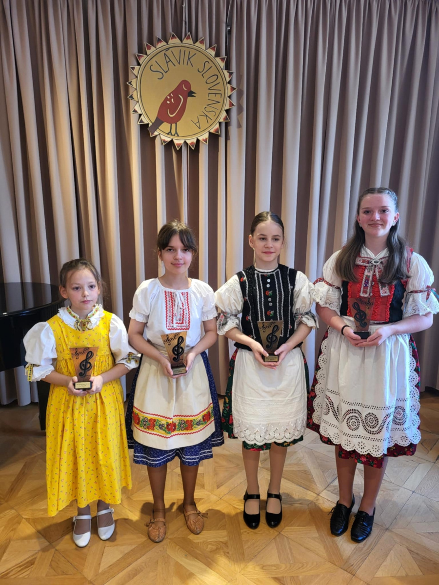 Ocenení si odniesli pekné trofeje a veríme i povzbudenie do ďalšieho spevu. Pri vyhodnotení sme ocenili výkony všetkých, ktorí sa zúčastnili, prekonali trému a vložili do piesní celé svoje srdiečko. Podujatie svojim precíteným spevom obohatila Danielka Kminiaková piesňami Veje vietor po doline a Dobrý večer šuhajova mamička. Danielka je absolventkou ZUŠ BŠ, držiteľkou Ceny Petra Dvorského v tejto súťaži z roku 2017, dnes členkou najprestížnejšieho profesionálneho slovenského ľudového umeleckého kolektívu SĽUK (nedávno sa dostala do speváckej zložky SĽUKu medzi tri najlepšie speváčky v konkurencii 30 záujemcov). Ľudové piesne sú nevyčerpateľnou studnicou krásy a vo svojej rôznorodosti a špecifikách jednotlivých folklórnych regiónov nám odovzdávajú i kus životnej múdrosti. „AKÝ CHLIEB SI NAPEČIEME, TAKÝ JESŤ BUDEME“ sme spievali po vyhodnotení v piesni Zelený je rozmarínček. Venovali sme ju p. uč. Jankovi k jeho narodeninám a tie slová posielame symbolicky na celé Slovensko. Víťazkám každej kategórie Hanke, Chloe a Izabele gratulujeme a na krajskom kole súťaže SS v Cinobani držíme palce.