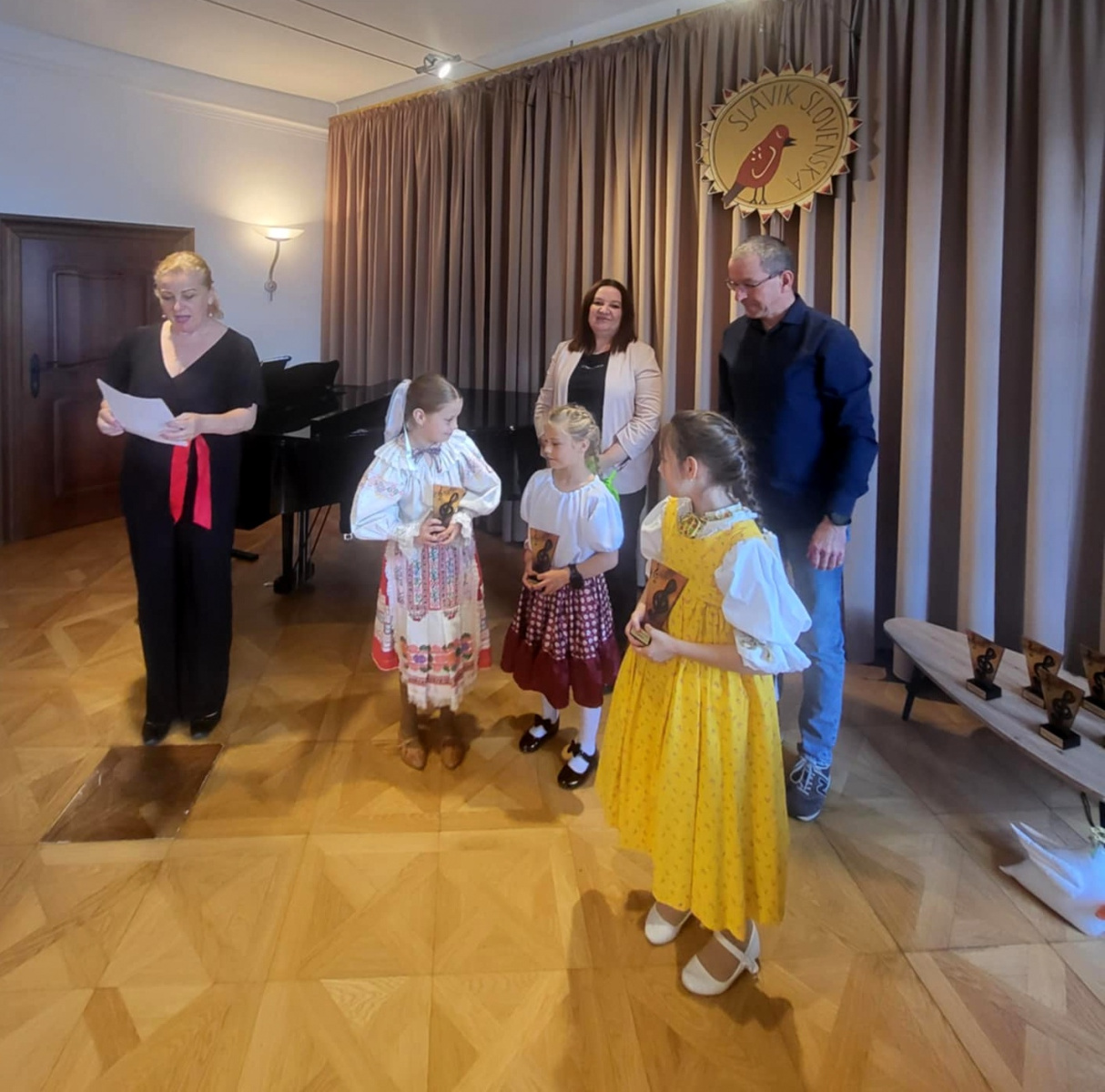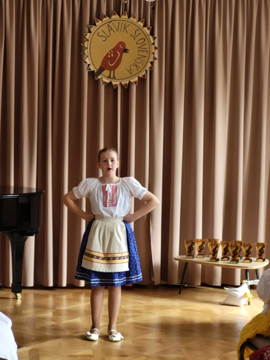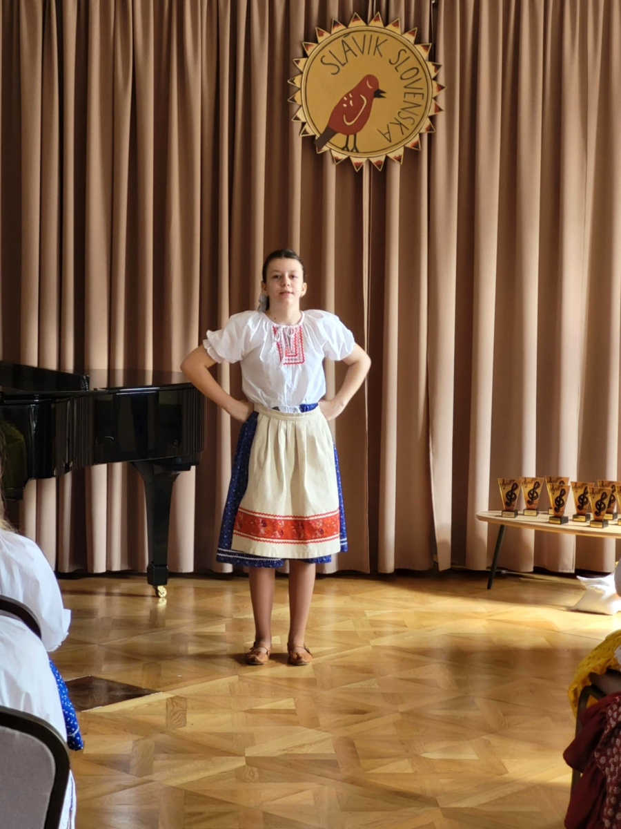 Ocenení si odniesli pekné trofeje a veríme i povzbudenie do ďalšieho spevu. Pri vyhodnotení sme ocenili výkony všetkých, ktorí sa zúčastnili, prekonali trému a vložili do piesní celé svoje srdiečko. Podujatie svojim precíteným spevom obohatila Danielka Kminiaková piesňami Veje vietor po doline a Dobrý večer šuhajova mamička. Danielka je absolventkou ZUŠ BŠ, držiteľkou Ceny Petra Dvorského v tejto súťaži z roku 2017, dnes členkou najprestížnejšieho profesionálneho slovenského ľudového umeleckého kolektívu SĽUK (nedávno sa dostala do speváckej zložky SĽUKu medzi tri najlepšie speváčky v konkurencii 30 záujemcov). Ľudové piesne sú nevyčerpateľnou studnicou krásy a vo svojej rôznorodosti a špecifikách jednotlivých folklórnych regiónov nám odovzdávajú i kus životnej múdrosti. „AKÝ CHLIEB SI NAPEČIEME, TAKÝ JESŤ BUDEME“ sme spievali po vyhodnotení v piesni Zelený je rozmarínček. Venovali sme ju p. uč. Jankovi k jeho narodeninám a tie slová posielame symbolicky na celé Slovensko. Víťazkám každej kategórie Hanke, Chloe a Izabele gratulujeme a na krajskom kole súťaže SS v Cinobani držíme palce.