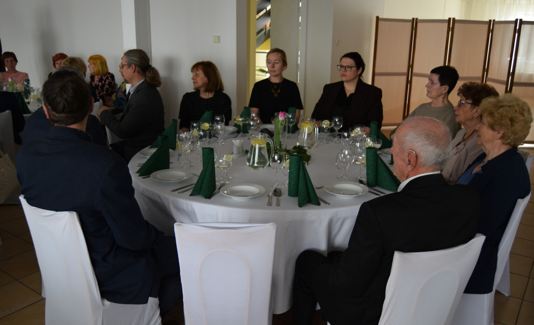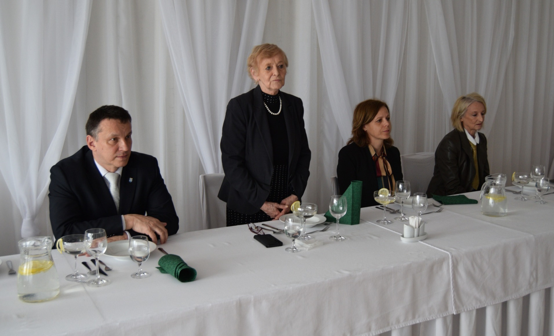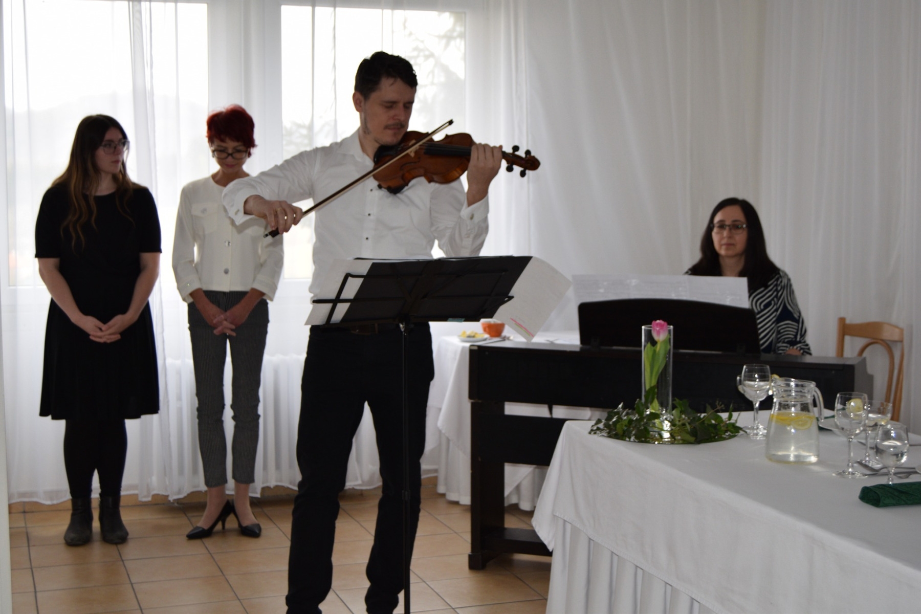 V ten istý deň, keď sme so Zboríkom reprezentovali mesto B. Štiavnica na krajskom kole súťaže Mládež spieva v Banskej Bystrici, pozvala na poludnie pani primátorka riaditeľov škôl a školských zariadení na slávnostný obed. ZUŠ pripravila kultúrny program. Na slávnostnom stretnutí pedagógov p. riaditeľku Chovanovú zastúpila p. zástupkyňa Katarína Tuhárska, ktorá všetkých prítomných pedagógov pozdravila a uviedla program. Zaznela Humoreska A. Dvořáka v podaní huslistu Juraja Janiczeka , klavírna spolupráca K. Tuhárska, Dve piesne z cyklu Cigánske melódie A. Dvořáka Když mňe stará matka a Struna naladena zaspievala p. uč. Petra Weisová, klavírna spolupráca p. uč. Tatiana Šusteková, ktorá následne zahrala klavírnu Sonátu B-dur časť Allegro W. A. Mozarta. Program ZUŠ zakončili Moravskými dvojspěvmi časťou Zajatá, kde opäť vynikol spev p. uč. Petry a husle p. uč. Janiczeka, klavírna spolupráca p. uč. Tatiana. Foto ŠN M. Kríž