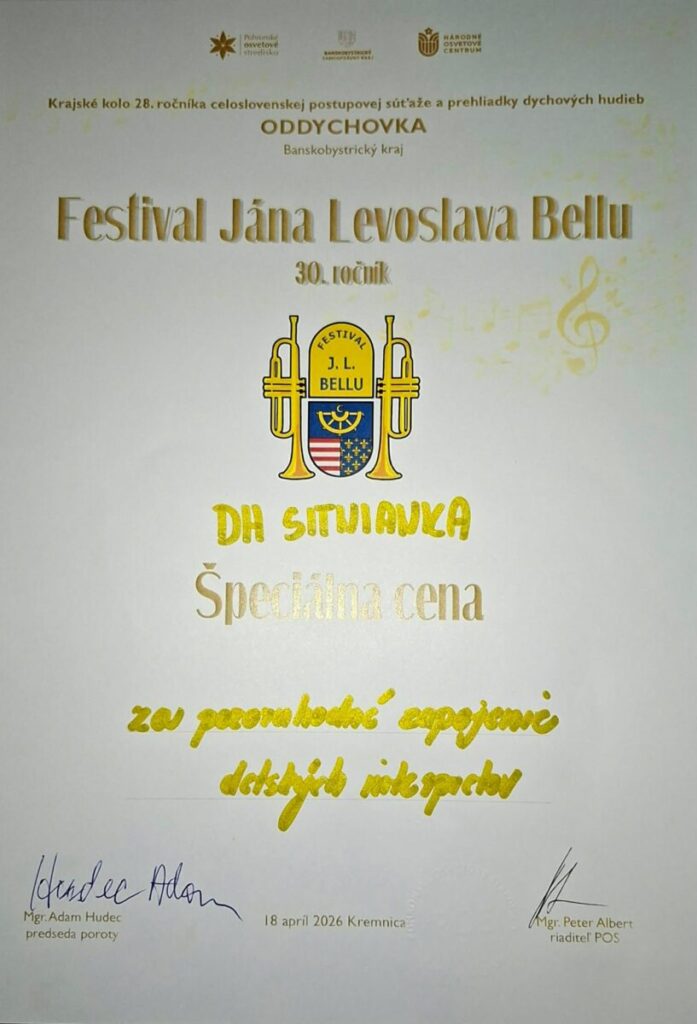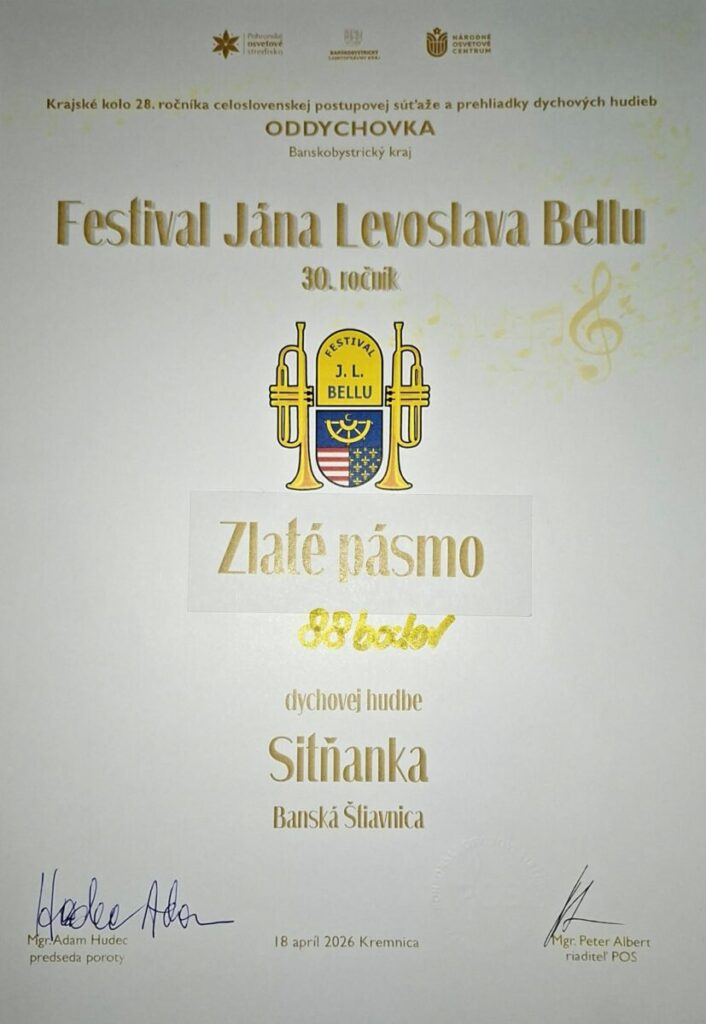 Na 30. ročníku Festivalu Jána Levoslava Bellu a krajskom kole celoslovenskej postupovej súťaže a prehliadky dychových hudieb ODDYCHOVKA sa okrem iných predstavila aj dychová hudba SITŇANKA, ktorú vedie náš pán učiteľ Aleš Turčan. Za program, ktorý tam uviedli, získali ZLATÉ PÁSMO. Pán učiteľ Aleš vedie a zapája i svojich žiakov k aktívnej účasti na živom vystupovaní.