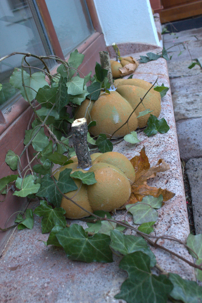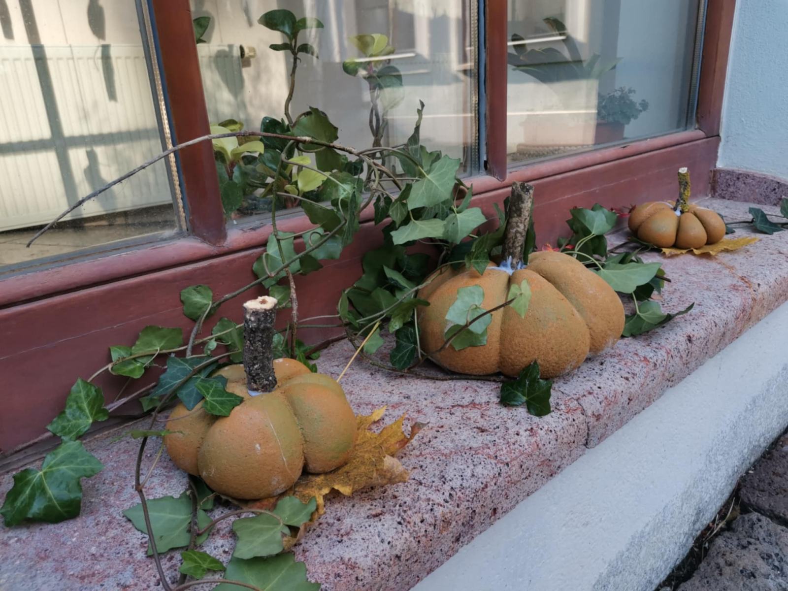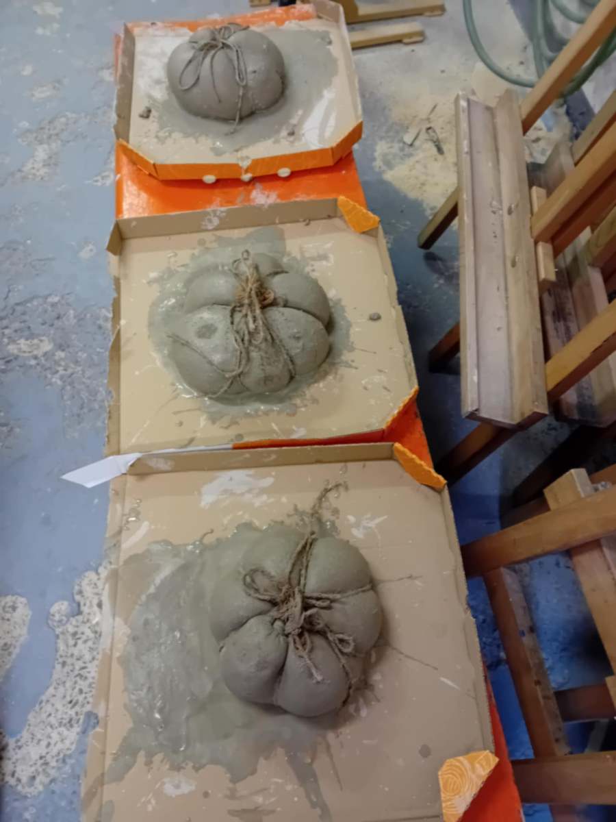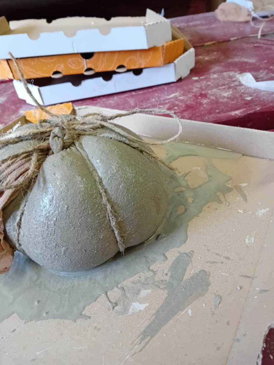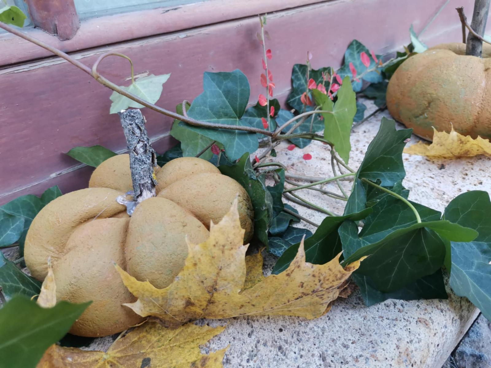 Cez leto sladké dyne , na jeseň tekvice: Z takých ako sme vyrobili na výtvarnej by ste si však fajnú tekvičkovú polievočku neuvarili. Aj keď sme ich tiež najprv namiešali ako tú polievočku v hrnci, ale mi murárskym miešadlom z betónu vo vedre. Betonové pomaľované tekvice odliate v starých pančuchách nám zdobili exteriér ZUŠ. (A budú aj na budúcu jeseň – nezhnijú ako tie zo záhrady).
