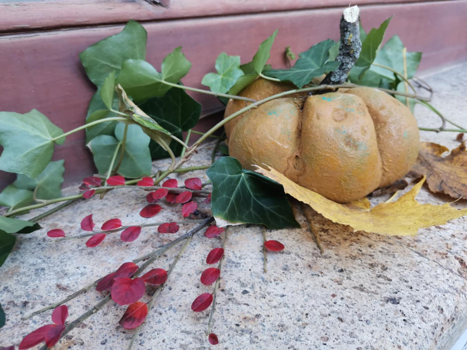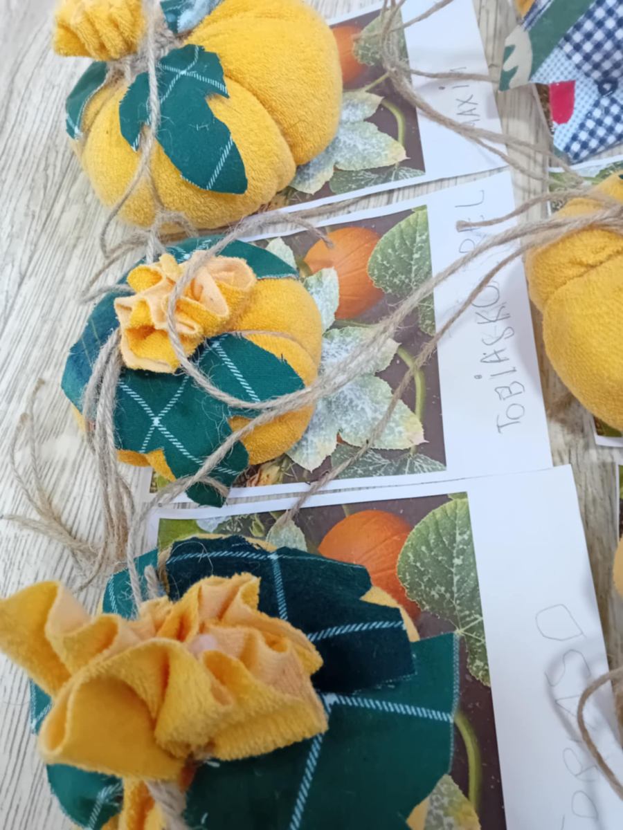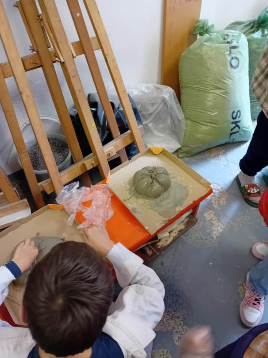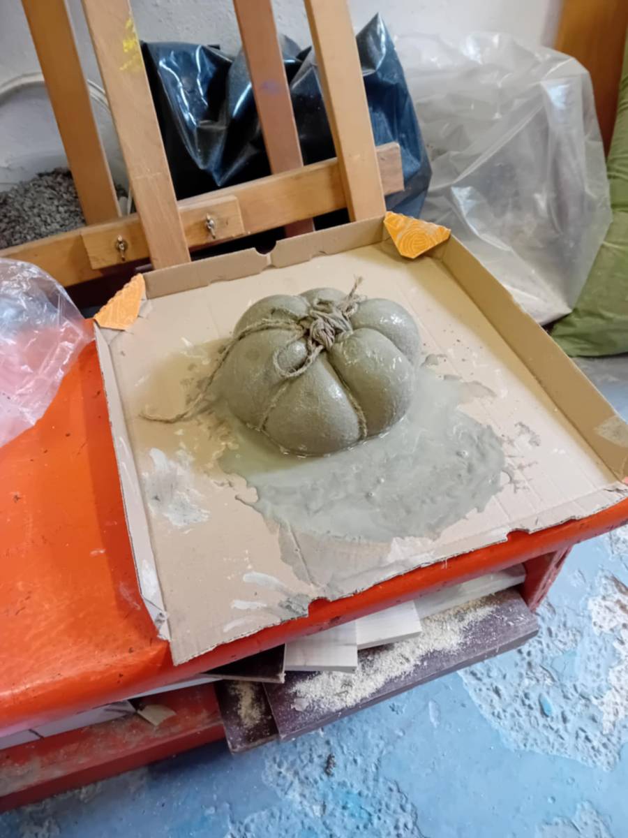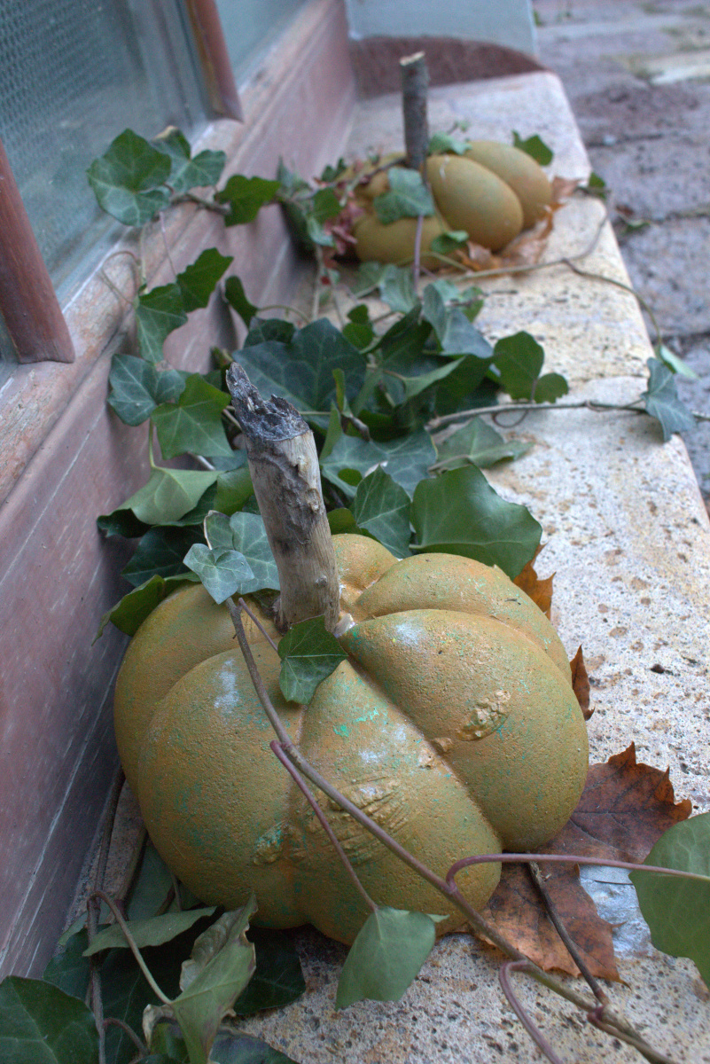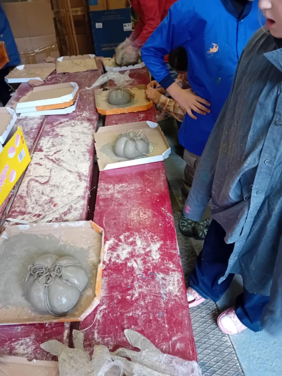 Cez leto sladké dyne , na jeseň tekvice: Z takých ako sme vyrobili na výtvarnej by ste si však fajnú tekvičkovú polievočku neuvarili. Aj keď sme ich tiež najprv namiešali ako tú polievočku v hrnci, ale mi murárskym miešadlom z betónu vo vedre. Betonové pomaľované tekvice odliate v starých pančuchách nám zdobili exteriér ZUŠ. (A budú aj na budúcu jeseň – nezhnijú ako tie zo záhrady).