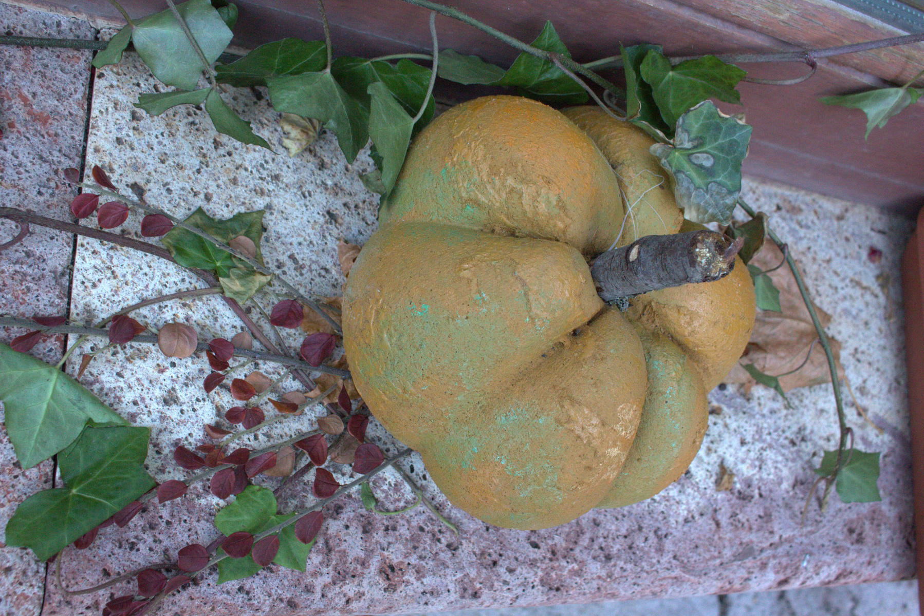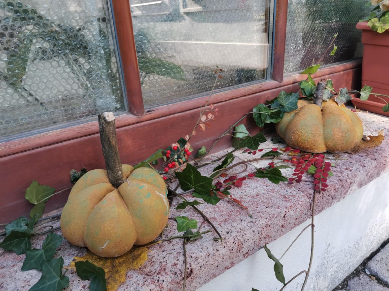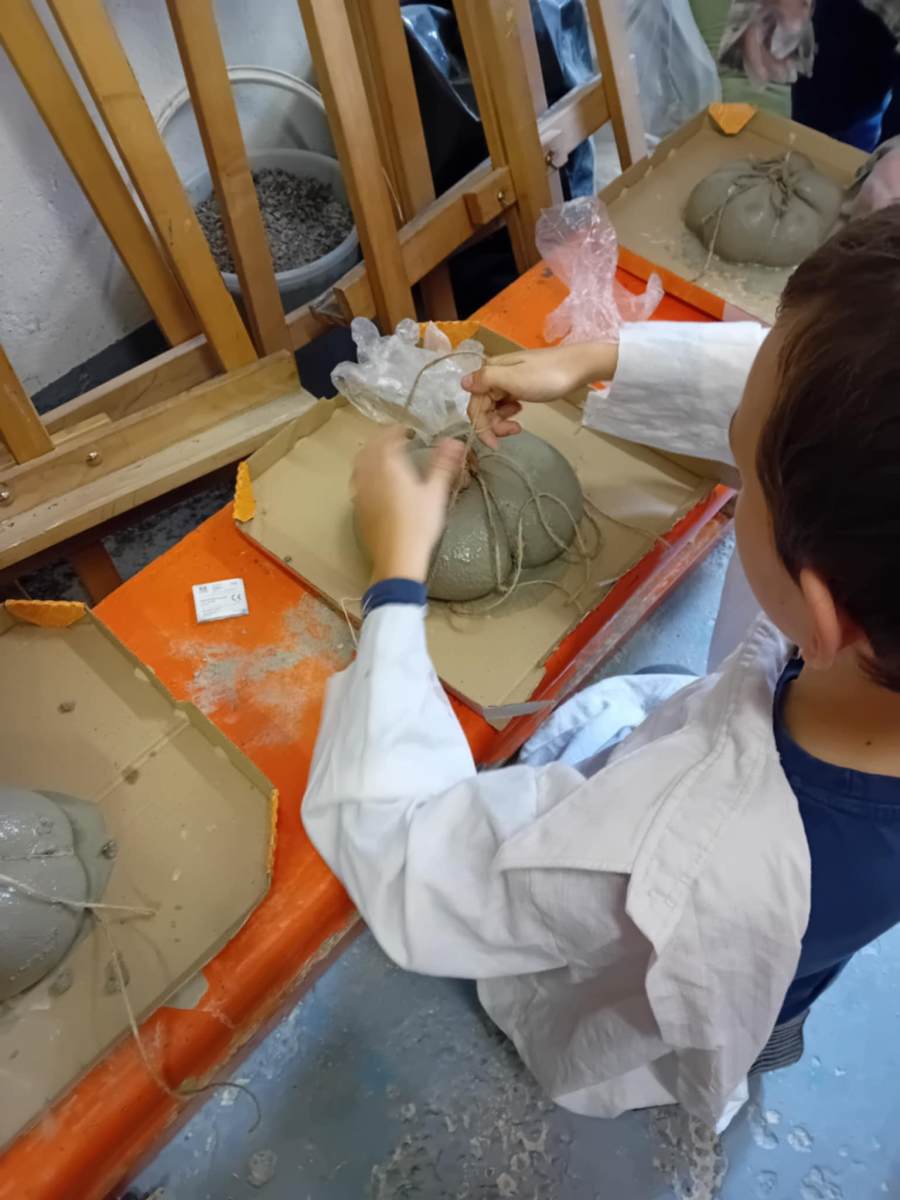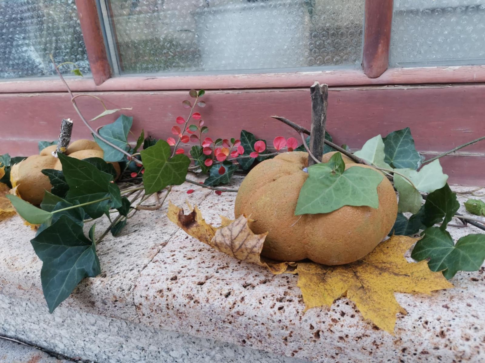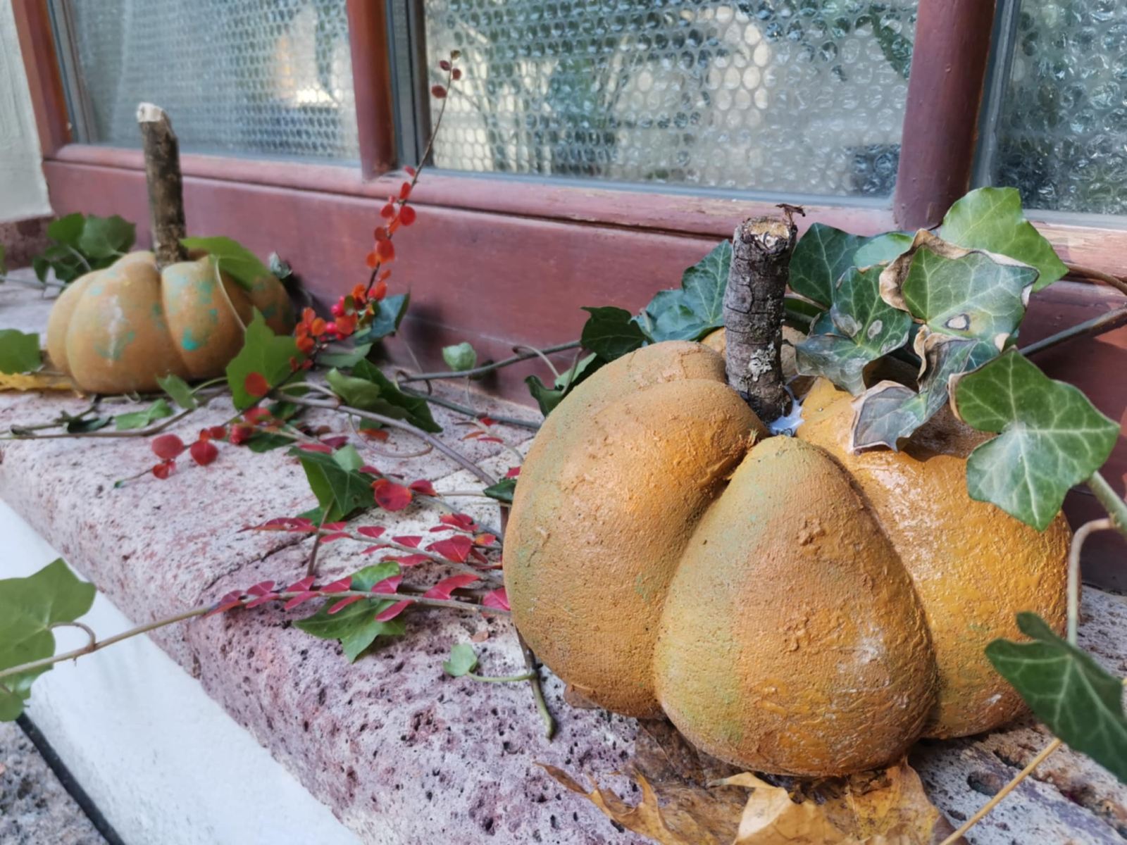 Cez leto sladké dyne , na jeseň tekvice: Z takých ako sme vyrobili na výtvarnej by ste si však fajnú tekvičkovú polievočku neuvarili. Aj keď sme ich tiež najprv namiešali ako tú polievočku v hrnci, ale mi murárskym miešadlom z betónu vo vedre. Betonové pomaľované tekvice odliate v starých pančuchách nám zdobili exteriér ZUŠ. (A budú aj na budúcu jeseň – nezhnijú ako tie zo záhrady).