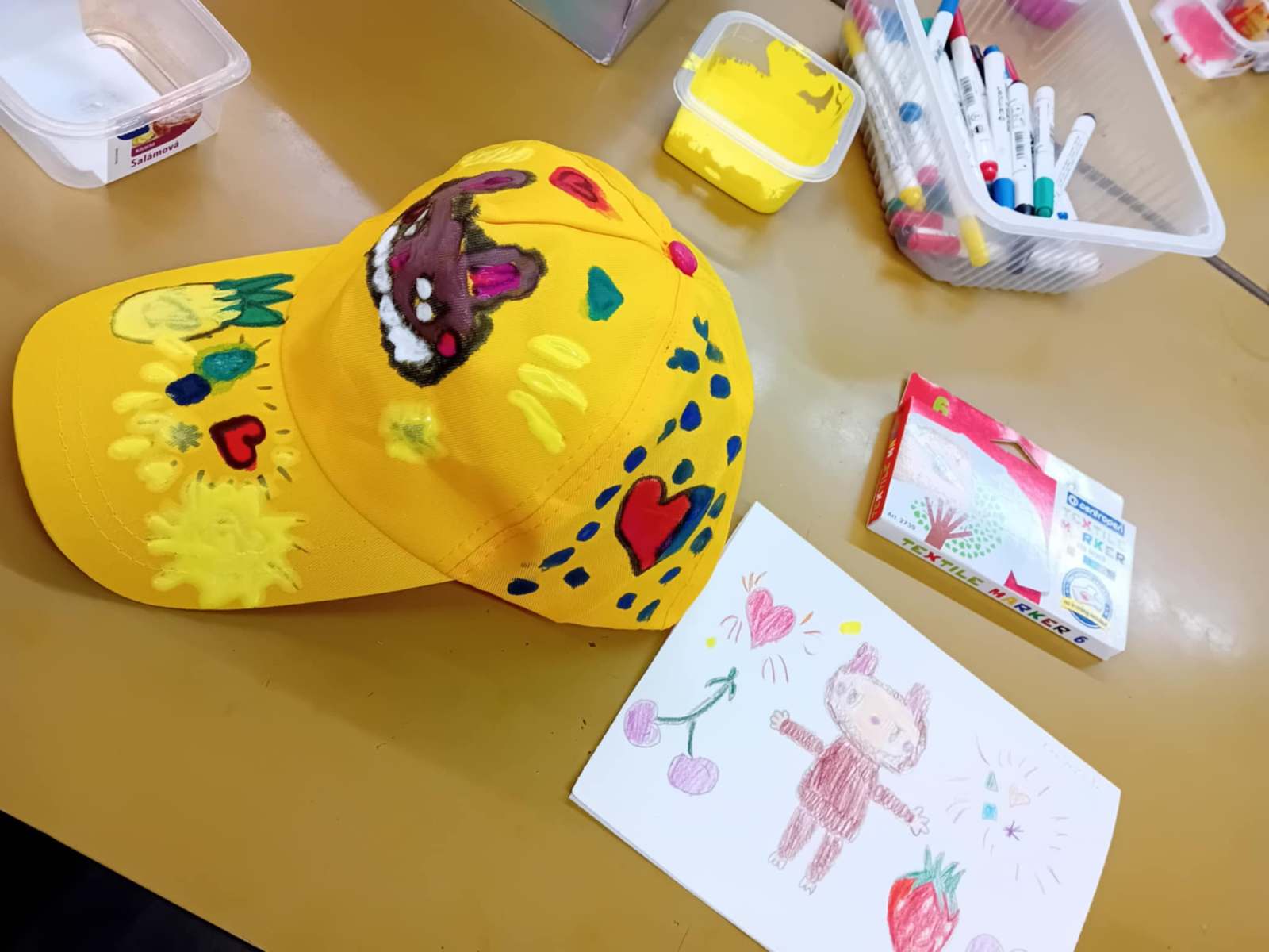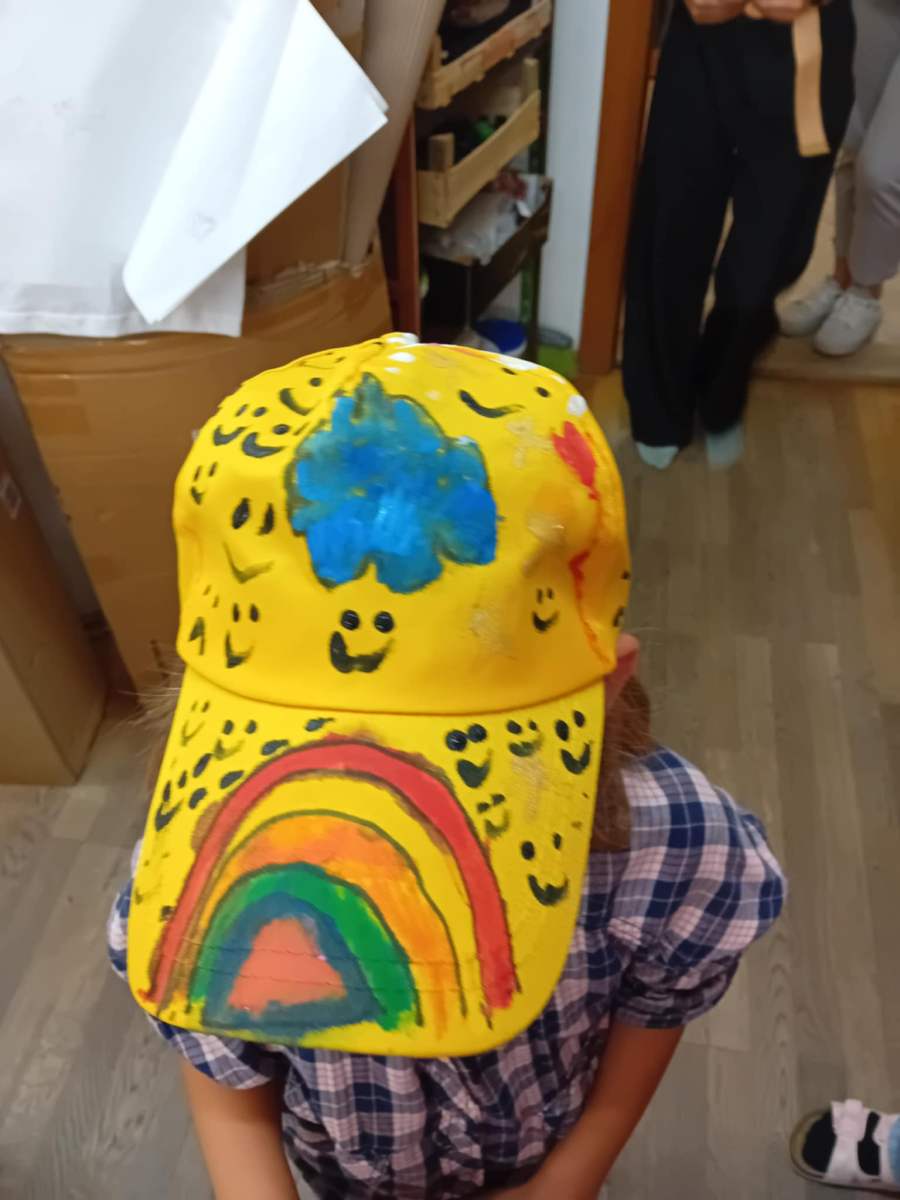 Aby im nefúkalo na hlávky, pomaľovali si  farbami na textil  žlté pestrofarebné šiltovky.