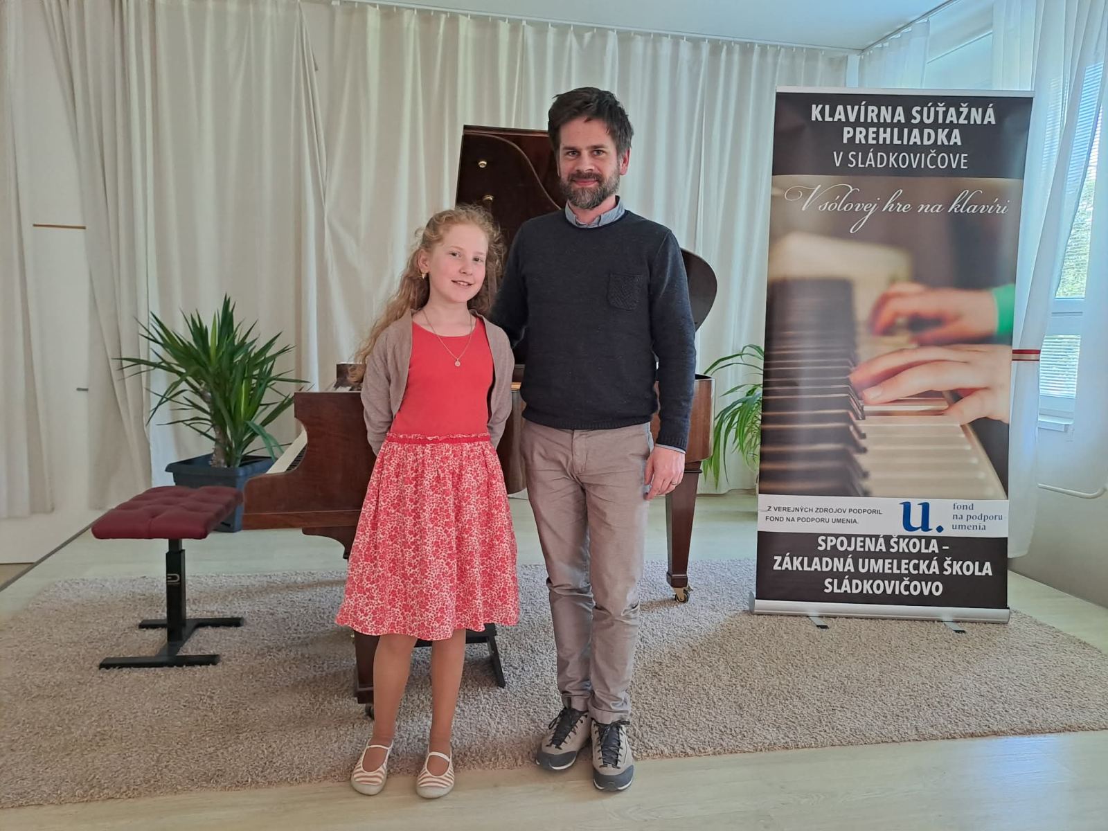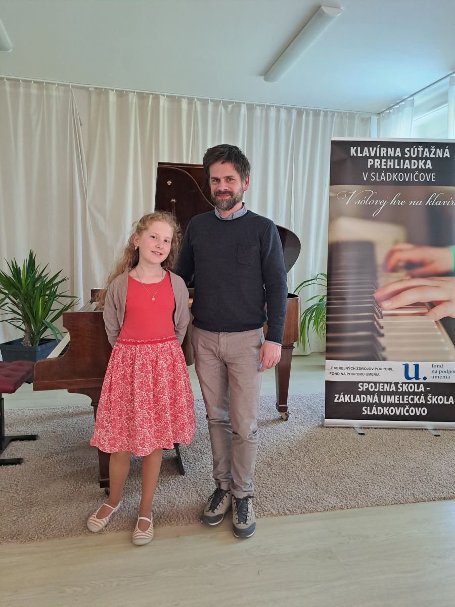 Minulý týždeň v piatok 24. apríla sa uskutočnil jubilejný 10. ročník celoslovenskej klavírnej súťaže, ktorú zorganizovala Základná umelecká škola v Sládkovičove. Mladí talentovaní klaviristi z rôznych kútov Slovenska predviedli svoje výnimočné hudobné schopnosti pred odbornou porotou aj širokou verejnosťou. Našu ZUŠ reprezentovalo Ľudmila Kamenská z triedy Martina Jánošíka, ktorá si za svoj výkon v skladbách Etuda Arama Chatschaturiana a Riwer Flows in You Yiruma odniesla zlaté pásmo. Gratulujeme!