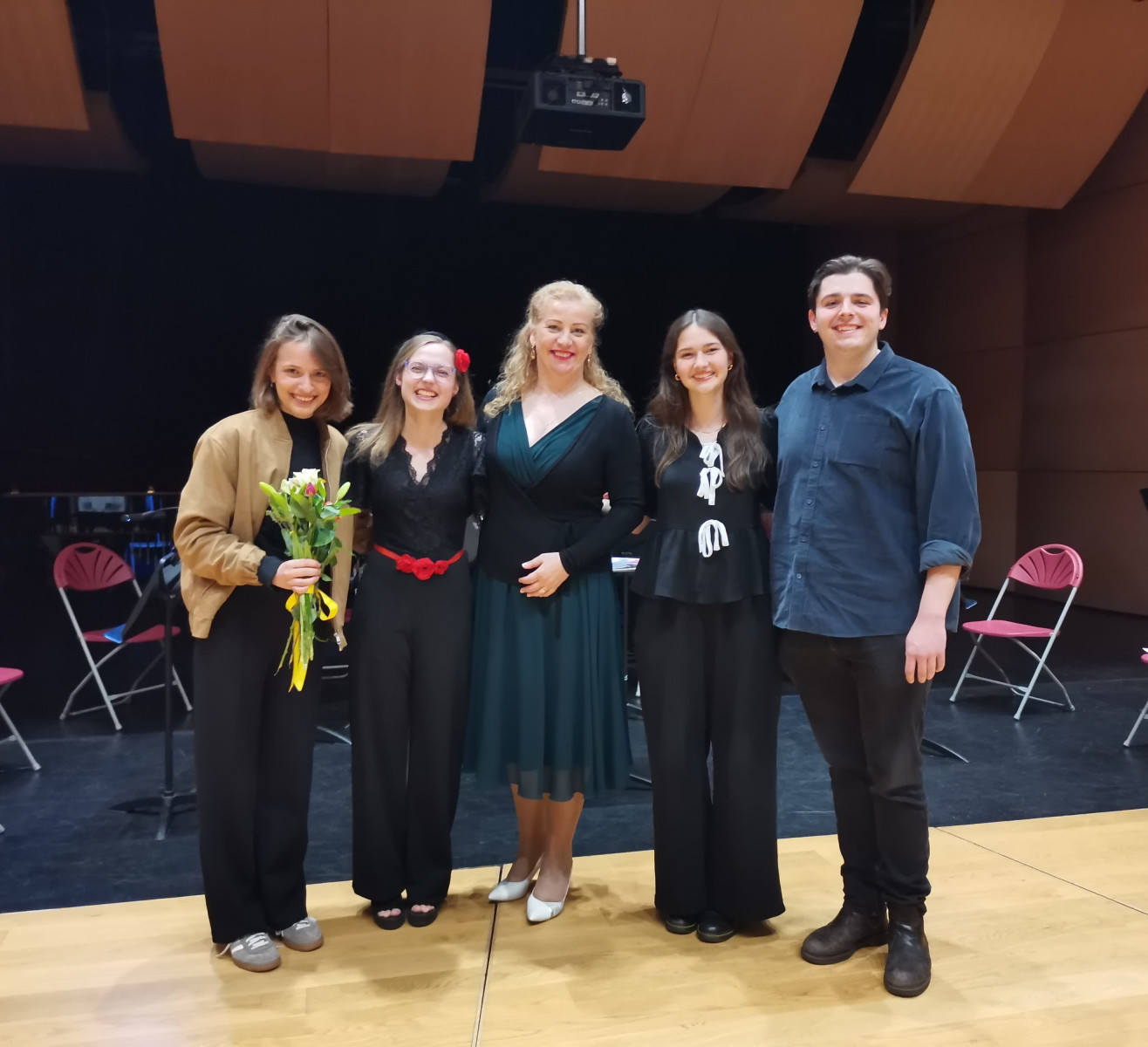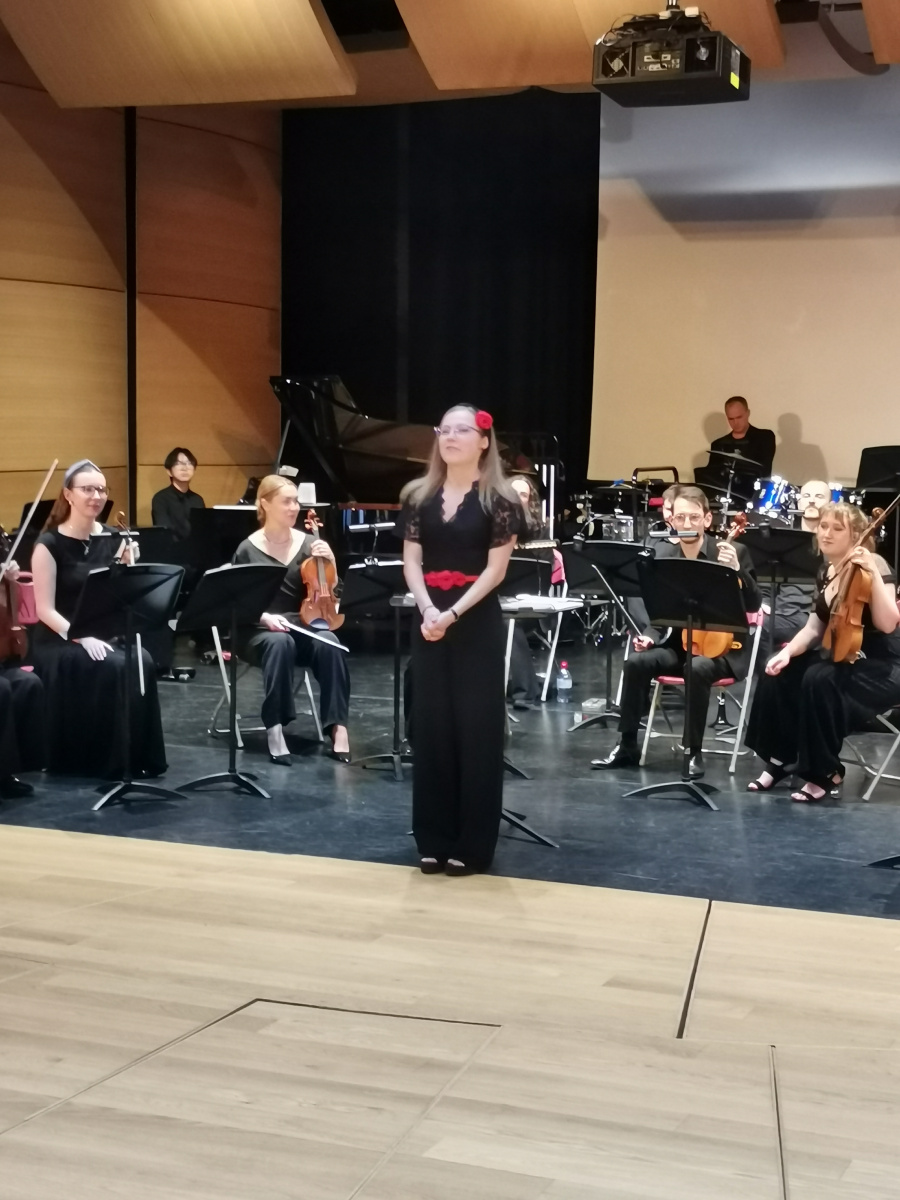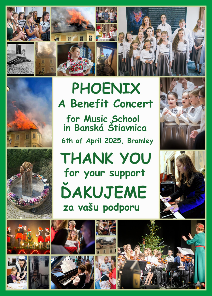 Dňa 6. apríla 2025 uskutočnila naša skvelá absolventka Lucia Švecová koncert v St. Catherine’s School v Bramely  (Anglicko).  Koncert nazvala PHOENIX so šľachetným úmyslom podporiť svoju banskoštiavnickú „Alma mater“. V nedeľu dopoludnia sme v krásnej koncertnej sále školy pripravili všetky nástroje, stojany, príslušenstvo (ďakujeme za pomoc Patrícia Zorvanová).   Nasledovala skúška s profesionálnymi hudobníkmi z rôznych škôl a konzervatórií. Komorný orchester pre túto príležitosť tvorili muzikanti hrajúci na flaute, hoboji, klarinete, trúbke, trombóne, perkusiách, klavíri. Ďalej to boli dvoje prvé husle, dvoje druhé husle, dvoje violy, dvaja violončelisti a hráč na tympany. Všetkých dirigovala LUCIA ŠVECOVÁ – slovensko-britská dirigentka, ktorá bola v zahraničí viackrát ocenená. V súčasnosti je hudobnou riaditeľkou zboru Shoreham Oratorio Choir a asistentkou dirigenta Symfonického orchestra a riaditeľkou kaplnkového zboru na St Catherine’s School, Bramley (Spojené kráľovstvo). Ako dirigentka Carlos Miguel Prieto na OAcademy študuje u renomovaných dirigentov, akými sú Marin Alsop a Vasily Petrenko, a v tejto sezóne bude asistentkou dirigenta v Opera Holland Park a Blackheath Halls Opera v Londýne. Okrem dirigovania orchestrov a speváckych zborov je Lucia aktívna aj ako aranžérka a organistka a venuje sa aj komunitnej hudbe a iniciuje workshopy s miestnymi základnými školami v Oxforde, Cardiffe a Cranleigh. Celý týždeň pred koncertom viedla organový workshop na súkromnej škole v Bramley, na ktorej študuje 1000 žiakov a študentov z Anglicka i z celého sveta. V nedeľu podvečer sa už konal samotný koncert. V jeho úvode Lucka predstavila hostí, privítala p. riaditeľku ZUŠ Irenu Chovanovú. Tá sa všetkým prítomným poďakovala za ochotu spolupodieľať sa na koncerte. Tiež obrázkom s podobizňou  Banskej Štiavnice poďakovala pani riaditeľke školy za zapožičanie sály a hudobných nástrojov. Pred uvedením si prítomní v sále mohli pozrieť dokumentárno-ďakovný film o aktivitách školy i tých ťažších momentoch v čase požiaru v centre B. Štiavnice. Tento koncert bol ale v prvom rade oslavou talentu a nadania mladých ľudí, ktorých hudba napĺňa, baví, živí, ktorí umenie tvoria, hudbou žijú i pomáhajú. Zazneli diela mladých britských skladateľov inšpirované živlom ohňa ako „From the Ashes“ od Darcy Cole, či „Fire Dances“ autora Tomosa Owena Jonesa. Darcy Cole je študentkou posledného ročníka kompozície na Royal Welsh College of Music and Drama. Darcy popri štúdiu vedie a skladá pre osemhlasný zbor Vena Vocals, ktorý debutoval v máji 2024 v sále Dory Stouzker s pôvodnou skladbou Through Dreams. Uvádza originálne skladby a aranžmány. Tomos Owen Jones je tenor a skladateľ zborových, inštrumentálnych a operných diel, často inšpirovaných ľuďmi a miestami Walesu. Jeho hudbu premiérovali BBC National Orchestra of Wales, The National Eisteddfod, Atmospheres Festival Cardiff a Leeds Lieder. Tomos bol víťazom kompozičnej súťaže WNO-RWCMD v roku 2021, súťaže Welsh Guards March v roku 2024 a v roku 2024 bol absolventom ORA Singers. 4 autorské piesne, z ktorých dve Lucka pre orchester sama zaranžovala, pridala len 22 ročná Slovenka žijúca v Spojenom kráľovstve, oceňovaná na Slovensku i v zahraničí Nina Kohout.  Študovala na prestížnej anglickej umeleckej škole The BRIT School. V roku 2021 získala cenu Radio Head za Nováčik roka za svoj debutový singel Blue Sunray. V roku 2024 vydala svoj debutový album Gentle Autopsy. Len koncom marca 2025 získala novinárske ocenenie Album roka 2024 na Radio_Head Awards 2024 za album Gentle Autopsy. V mestečku Bramley sa spojili mladí talentovaní umelci s dobrým úmyslom. Počas krátkeho pobytu v Anglicku sme mali možnosť vidieť kus čarovného anglického vidieka s krásnymi kostolmi, krásne katedrály a kultúrne pamiatky hlavného mesta Londýna, v Národnej galérii zahliadnuť originály obrazov Vincenta van Gogha (ako napr. Slnečnice, Stolička), Paula Gauguina (Váza kvetov), Pierra -Auguste Renoira (Misia Sert).   V Hatschlands parku v múzeu s botanickou záhradou sme uzreli čembalá a historické klavíre, na ktorých hrali Chopin, Beethoven, či Schubert. S Luciou sme mali možnosť zahrať si aj na organe.