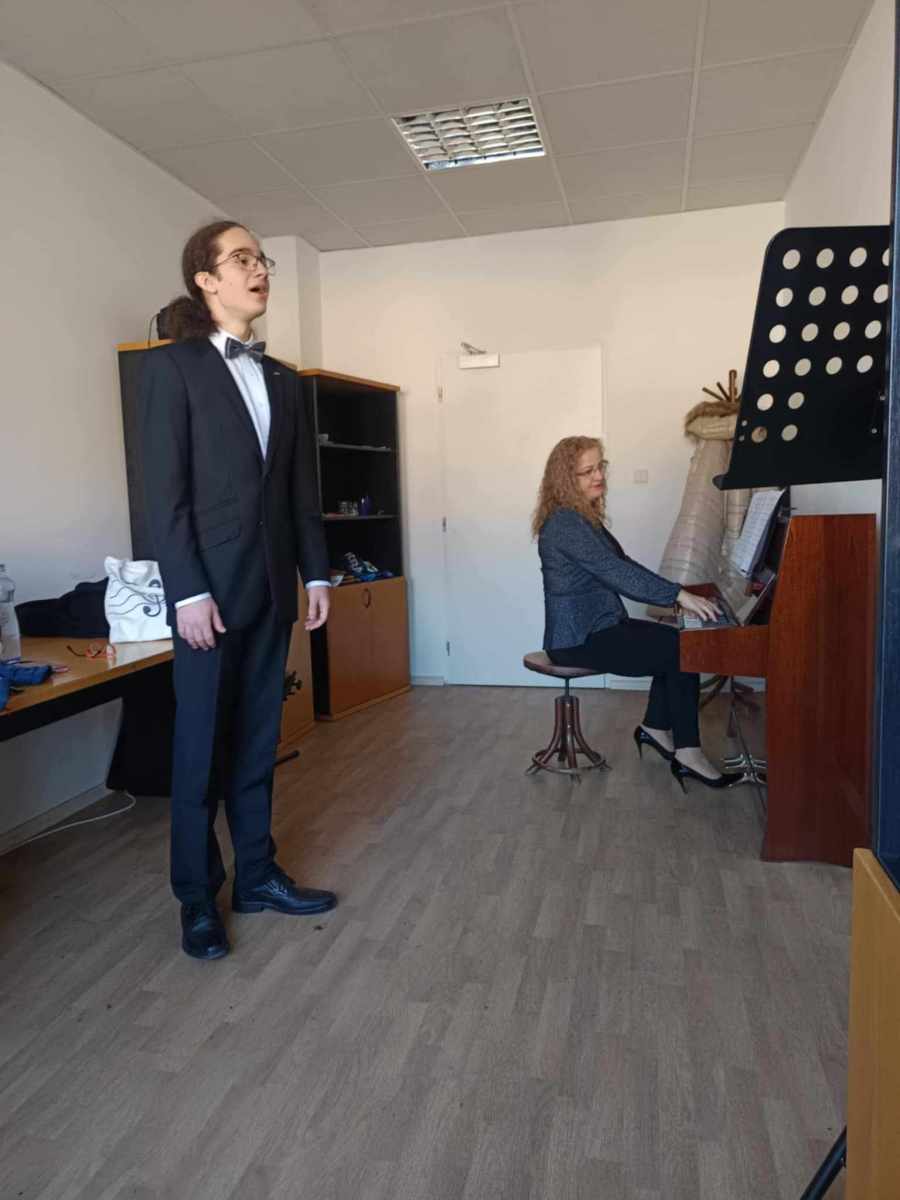 David Knížek navštevuje našu ZUŠ neprestajne 14 rokov /teda od svojich 5. rokov/. Okrem hodín spevu sa zdokonaľuje aj v hre na klavír a organ, je členom Zboríku. Priebežne aktívne vystupuje na koncertoch a zúčastňuje sa speváckych súťaží. V roku 2023 – deň pred požiarom – získal titul Laureáta na speváckej súťaži Stančekova Prievidza. Spev mu prirástol natoľko k srdcu, že sa ho rozhodol študovať na vysokej škole. V tomto školskom roku maturuje na Gymnáziu Andreja Kmeťa a súčastne absolvuje spev na ZUŠ. Počas uplynulého polroka sa intenzívne pripravoval na talentové skúšky na Akadémiu umení. Uchádzači o štúdium museli splniť predpísané podmienky. V rámci vokálnej interpretácie museli preukázať hlasové kvality s predpokladom ďalšieho rozvoja, teoretické znalosti v rozsahu látky konzervatória, podrobili sa skúške z intonácie, spevu z listu ako aj z hereckej a pohybovej schopnosti. David sa skúšobnej komisii predstavil sl. ľudovou piesňou v úprave Pavla Kršku „Hoj, pofukuj, povievaj“, zaspieval dve umelé piesne rôznych štýlových období /“Anima Christi“ Marca Frisinu a „Alma del core“ Antonia Caldaru/. Z povinných operných, oratórnych či kantátových árií si vybral z Mozartovej Čarovnej flauty áriu veľkňaza Sarastra: „O Isis“ a z Händlovej opery Alcina áriu „Verdi prati“. Davida na prijímacie skúšky pripravovala a klavírnu korepetíciu zabezpečila p. uč. Irena Chovanová.