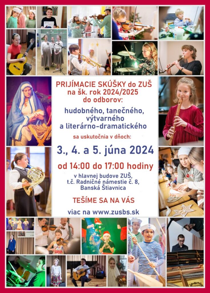 Prijímacie skúšky na školský rok 2024/2025 do hudobného, tanečného, výtvarného a literárno-dramatického odboru sa uskutočnia v dňoch 3., 4. a 5. júna 2024 v čase od 14:00 do 17:00 hodiny v hlavnej budove ZUŠ, t.č. Radničné námestie č. 8, Banská Štiavnica.