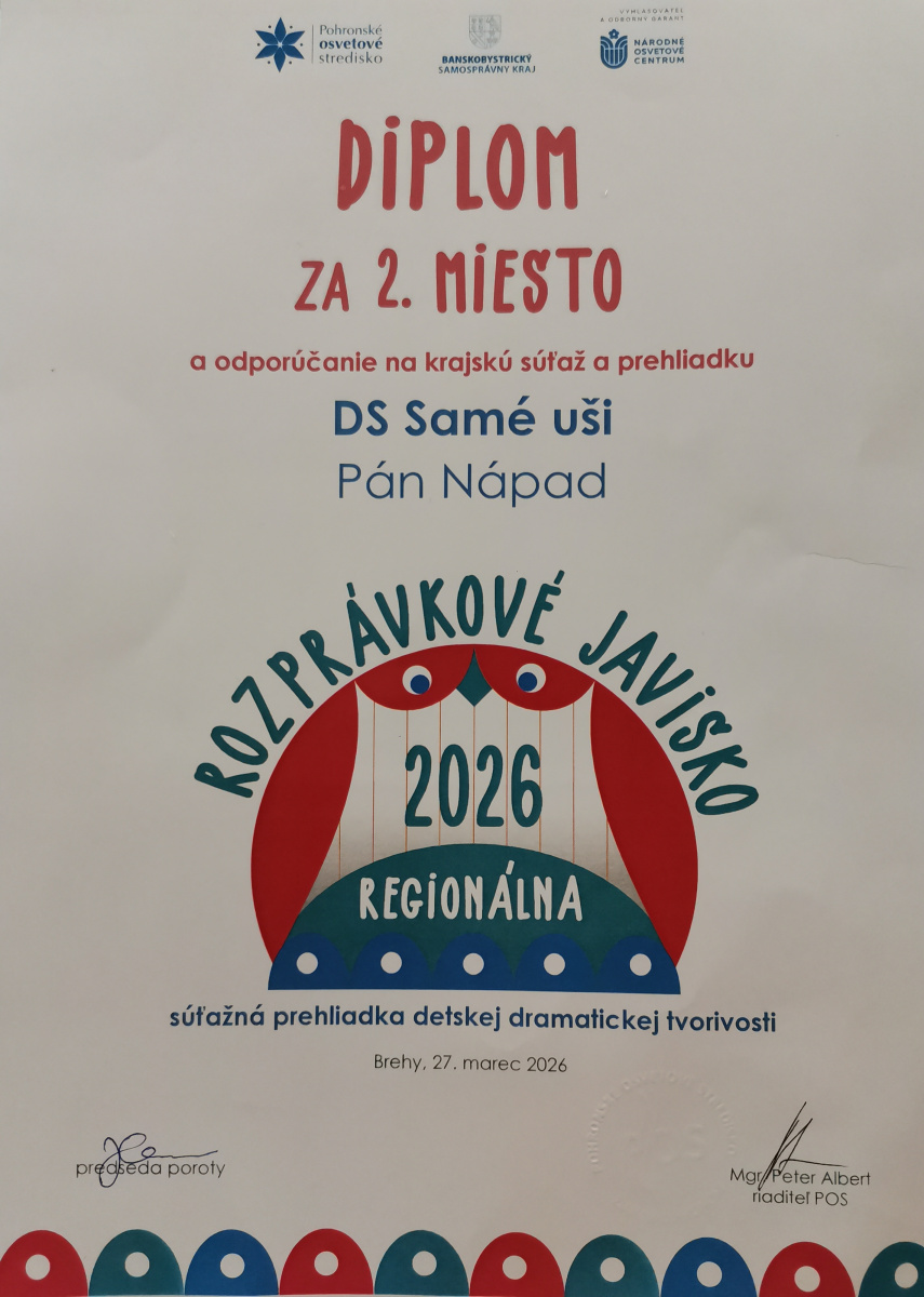Žiaci LDO sa s p. učiteľkou Ľudmilou Klimkovou vybrali na Rozprávkové javisko do Brehov. Na takomto podujatí sa mohli konfrontovať s úrovňou iných detských súborov ako DS Zrkadlo zo ZUŠ v Kremnici, či DS Sovíčatá pri ZŠ s MŠ M. Hella Štiavnické Bane, DS Budúce herečky sveta pri CVČ Nová Baňa. Náš dramatický súbor „Samé uši“ sa prezentoval s divadelným predstavením Pán Nápad (zachraňuje svet) na motívy knihy Jána Uličianskeho. Dôležitý odkaz pre nás všetkých s dôrazom na ochranu zvierat v prírode. DS v zložení Ľudka Kamenská, Dorotea Dravecká, Alma Mĺkva, Dorka Proroková, Malvína Faráriková a Juraj Marťušev si za svoj pekný výkon vyslúžili spomedzi 6 súborov krásne 2. miesto s odporúčaním postupu na krajské kolo. GratulujemeĎakujeme p. uč. Ľudke za prípravu a sprevádzanie, tiež p. Petrovi Kamenskému a Marošovi Ivaničovi za odvoz a pomoc s deťmi.