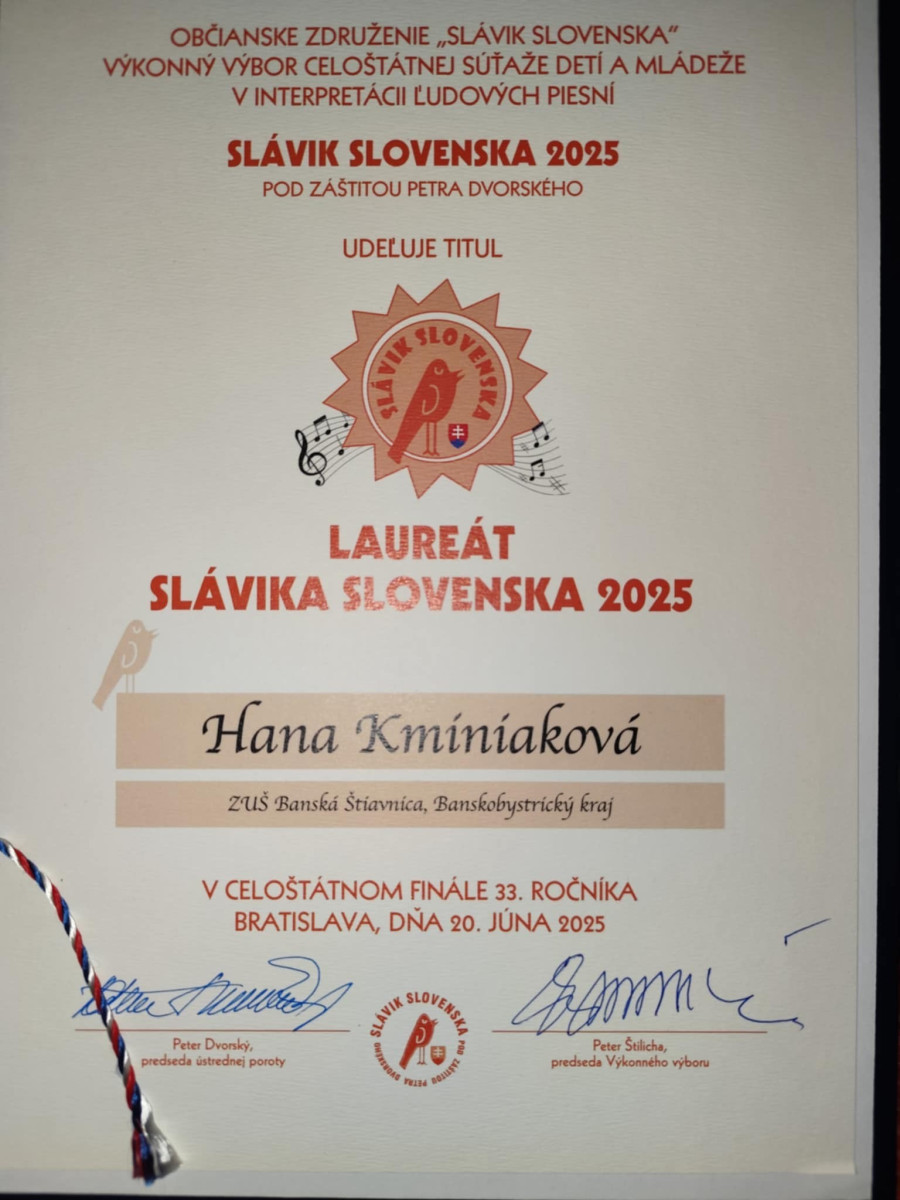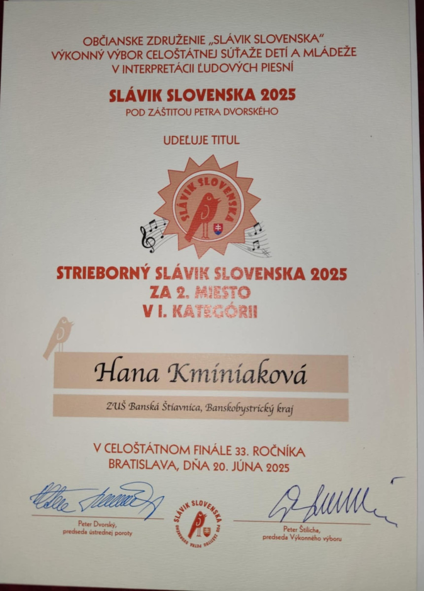 Žiačka speváckej triedy Ireny Chovanovej Hanka Kminiaková v Bratislave obhájila po roku titul STRIEBORNÝ SLÁVIK na finálovom celoštátnom kole 33.ročníka súťaže Slávik Slovenska 2025.