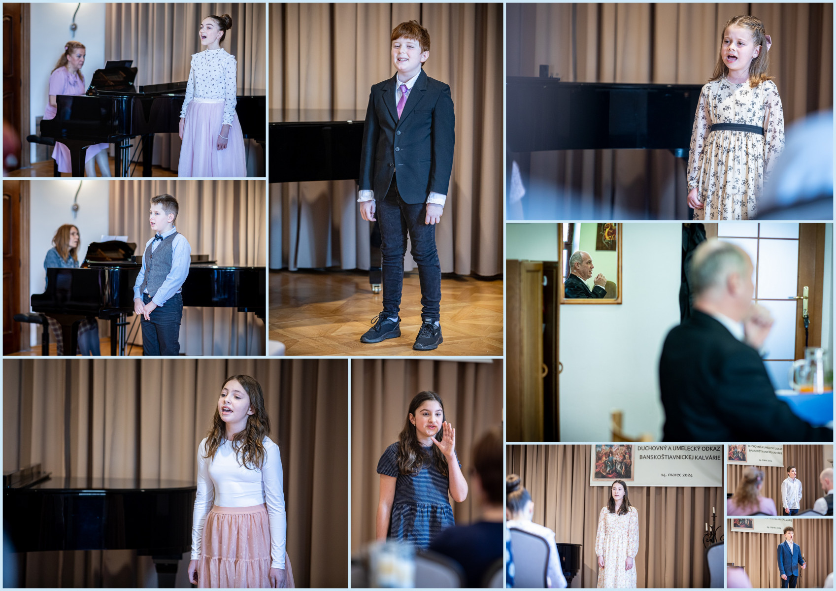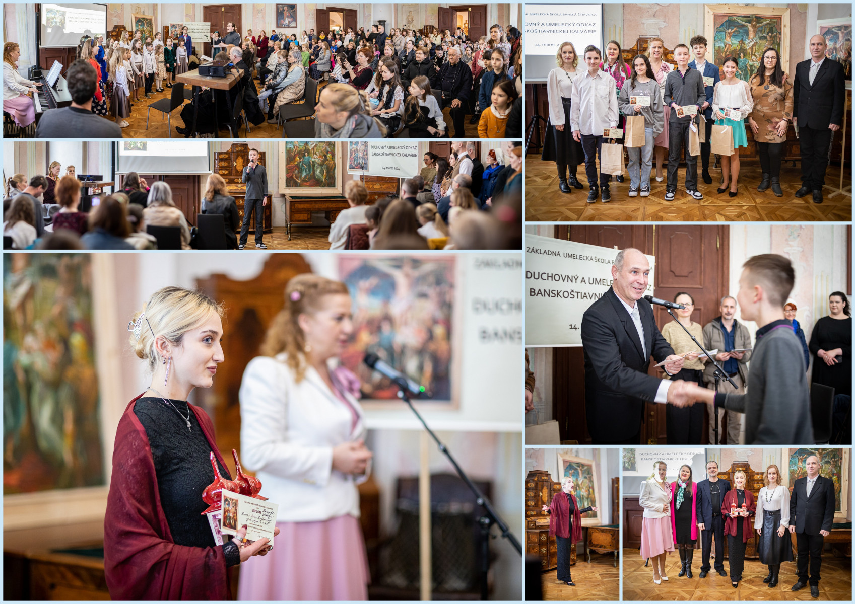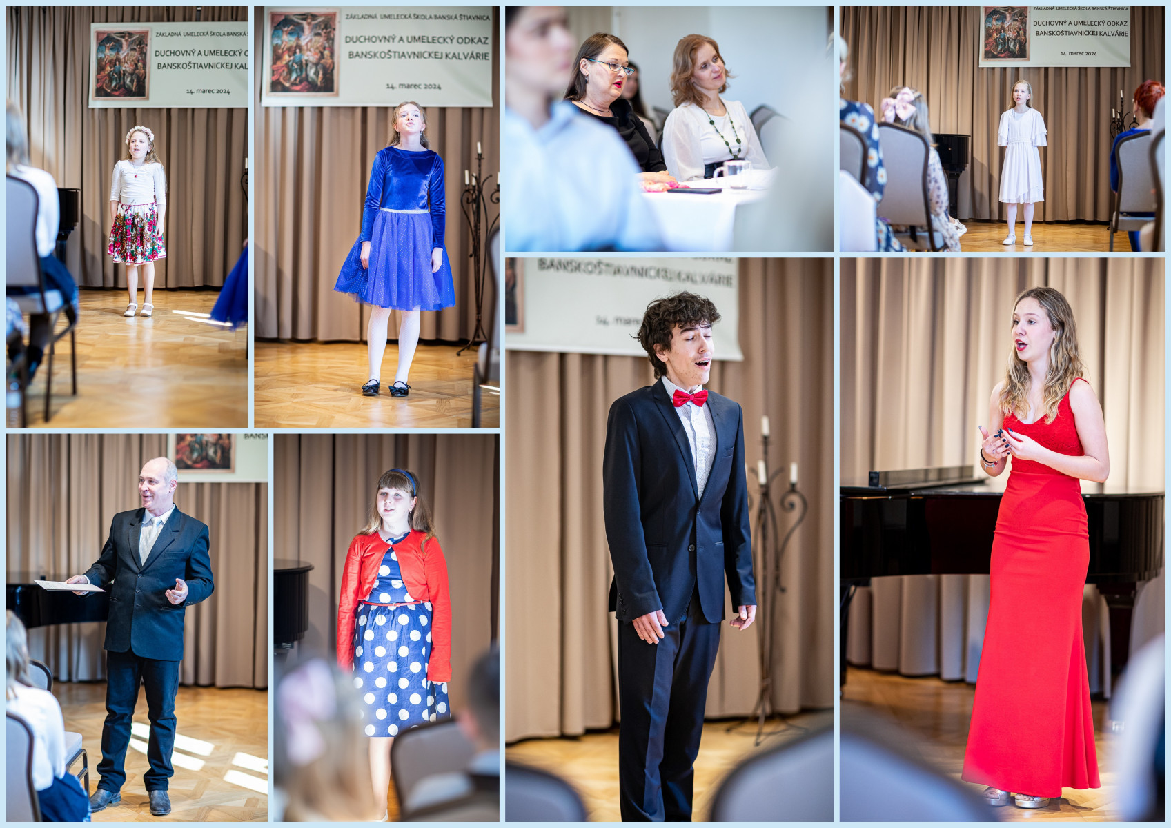 „Konečným a vrcholným cieľom všetkej hudby by mala byť iba sláva Božia a osvieženie duše.“ Čím zdôraznila cieľ a význam súťaže. Sálou sa niesli ľudové piesne v kombinácii s hĺbavými gospelovými, či sakrálnymi piesňami. Účinkujúcich uvádzali páni učitelia – konferencieri Terézia Beňová a Michal Timko. Bezmála 40 žiakov z dvanástich ZUŠ-iek od Bratislavy až po Poprad potešilo spevom prítomné publikum v sále i odbornú porotu. Tvorili ju osobnosti, ktoré majú dlhoročné skúsenosti s interpretáciou spevu a sú zároveň pedagogicky činní na rôznych stupňoch umeleckých škôl. Členka poroty Mgr.art. Miroslava Mičicová, ArtD., hlasová pedagogička zo ZUŠ Jána Cikkera B. Bystrica, Mgr.art. Stanislav Bartko, ArtD. zo Súkromného konzervatória vo Zvolene. Predsedníčkou speváckej poroty bola prof. Mgr. art. Mária Tomanová, ArtD., bývalá sólistka Štátnej opery v B. Bystrici a dlhoročná hlasová pedagogička na Akadémii umení a Konzervatóriu J. L. Bellu v B. Bystrici. Intonáciu, rytmus, výraz, agogiku, súhru s korepetítorom, vhodnosť výberu ako i celkový dojem hodnotili po kategóriách. Po obedovej prestávke sa účastníci presunuli do priestorov Kammerhofu, kde sú vystavené ocenené výtvarné diela. Priestor zaplnili mladší i vekom zrelší výtvarníci z celého Slovenska, ktorých spolu so spevákmi vítal Zborík gospelovou piesňou „Božia láska príď“ a pani Katarína Kissová svojou básňou „Kalvária“. Moderátor pán učiteľ Michal Timko privítal vzácnych hostí. Ich príhovory pretkávali vyhlasovanie víťazov a odovzdávanie cien. Pán Martin Macharik ako poslanec mestského zastupiteľstva i ako predseda Kalvárskeho fondu vyjadril radosť, že sa mnohé zničené objekty podarilo obnoviť a oživiť, a že naša škola súťažou vzdáva úctu jedinečnej dominante nášho mesta. Pán dekan banskoštiavnického dekanátu Norbert Ďurdík zdôraznil duchovný rozmer Kalvárie a z rúk pána Dušana Súlovca prevzal obraz s výjavom z krížovej cesty UKRIŽOVNIE (olejomaľba, plátno). Bol to pán Súlovec, ktorý po požiari svojimi obrazmi podporil našu ZUŠ a tiež s dojatím sledoval krásne výtvarné i spevácke výkony. Zborík v piesni „S láskou Kristovou“ pripomenul význam pôstneho obdobia: „Boh sa človekom stal, svojho Syna nám dal, k hriešnym k nám prišiel Pán. Z tŕnia korunu mal, hriech náš na seba vzal, z mŕtvych vstal náš Ježiš Kráľ“. V refréne roztlieskal obecenstvo, keď priniesol „radostnú a krásnu zvesť“. K výtvarníkom sa prihovoril akademický sochár Vladimír Oravec, ktorý ocenil tvorivé počiny detí z celého Slovenska a povzbudil ich k ďalšej tvorbe. Pani profesorka Mária Tomanová krátko zhodnotila výkony spevákov a ocenila prácu celého nášho kolektívu na organizácii pre ňu tak krásneho podujatia. Stanko Bartko ako skúsený moderátor Rádia Regina – stred sa ujal aj vyhlasovania výsledkov. Priestor dostali aj porotou vybraní speváci, ktorí pohladili duše prítomných. Tatiana Mrázová z Popradu gospelovou piesňou „Aj na cestách zlých“ rozsvietila sálu anjelským úsmevom, Lukáš Červený z Nových Zámkov ukázal čistotu spevu i srdca v slovenskej ľudovej piesni „Keť som bol maľučki, keď som ovce pásol“. Ocenili sme aj najmladšiu speváčku sedemročnú Hanku Kminiakovú. Za vernosť súťaži a tvorivý prínos bola odmenená pani učiteľka PaedDr. Petra Cmarková Breče z CZUŠ sv. Gorazda Vrbové.
